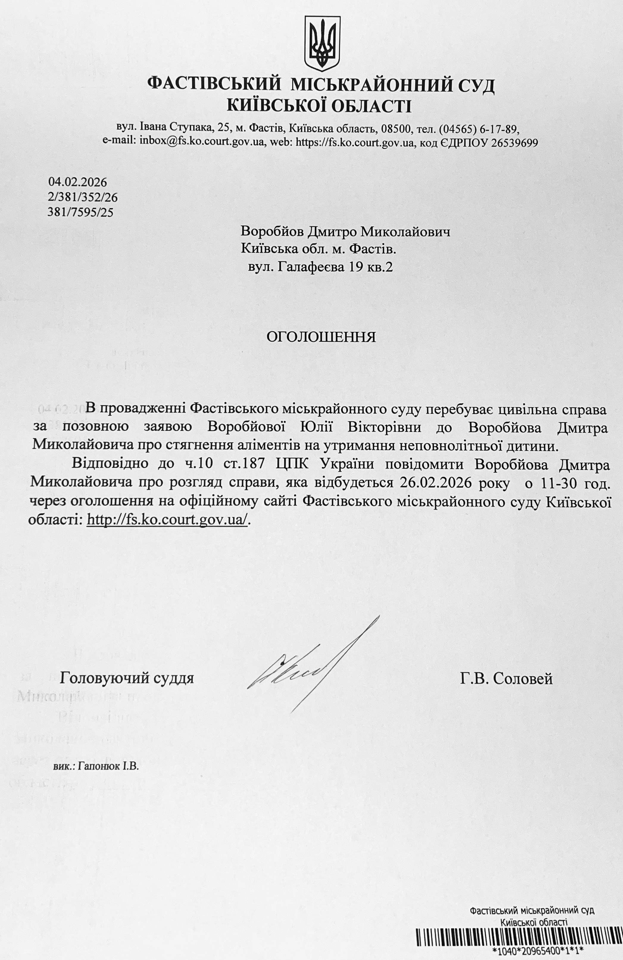 Фастівський міськрайонний суд Київської області викликає Воробйова Дмитра Миколайовича