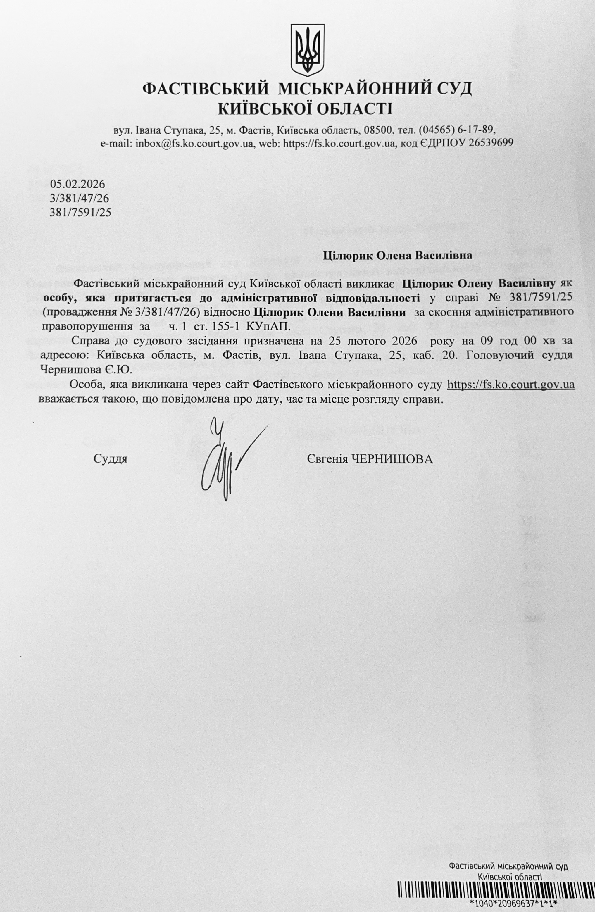 Фастівський міськрайонний суд Київської області викликає Цілюрик Олену Василівну
