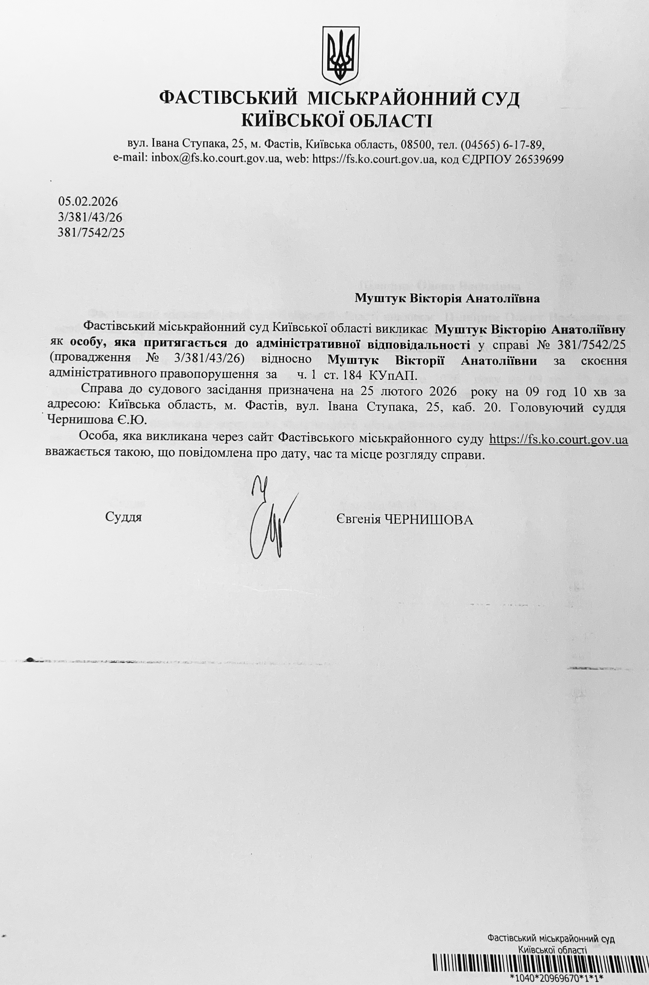 Фастівський міськрайонний суд Київської області викликає Муштук Вікторію Анатоліївну