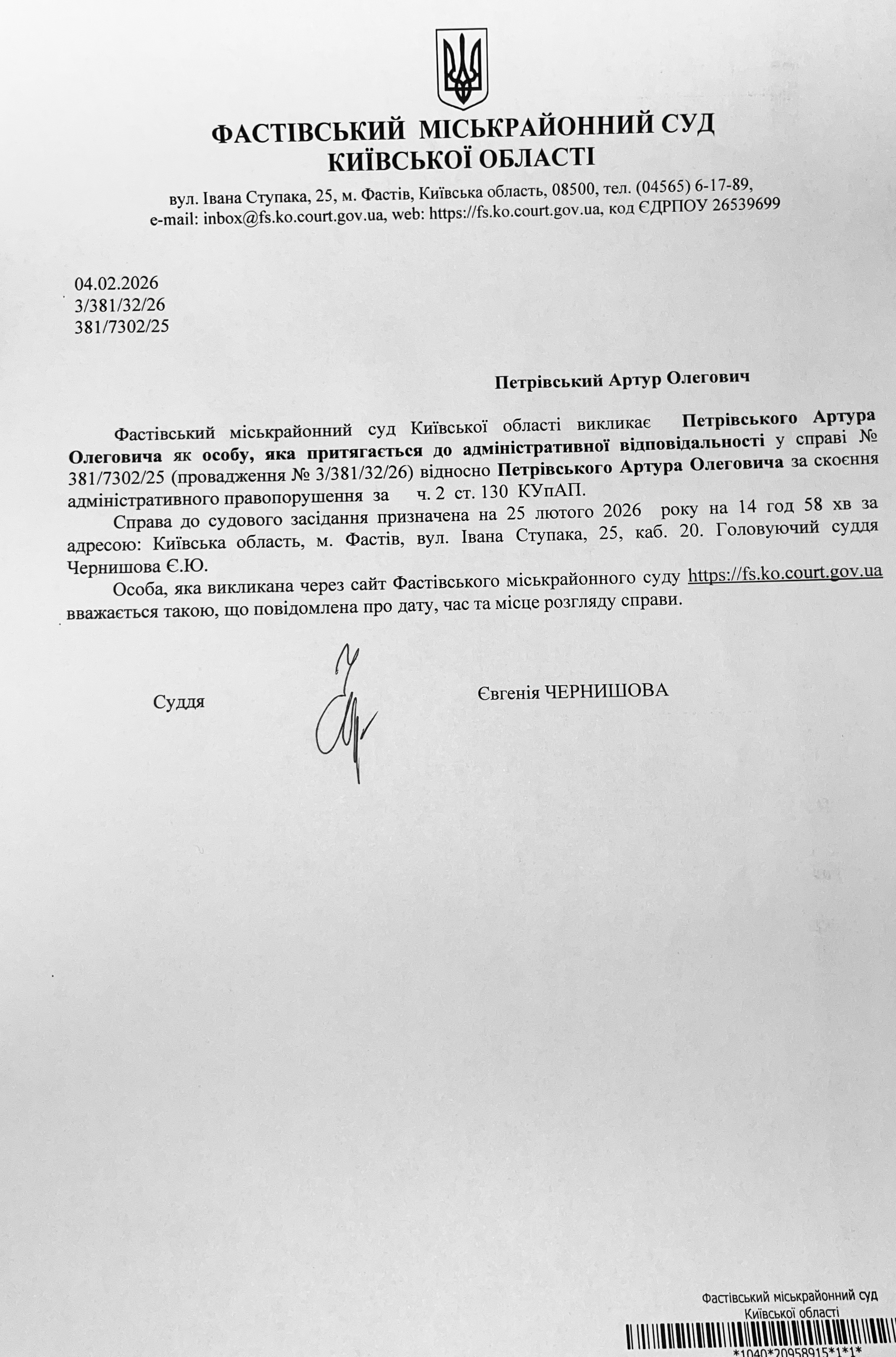 Фастівський міськрайонний суд Київської області викликає Петриківського Артура Олеговича