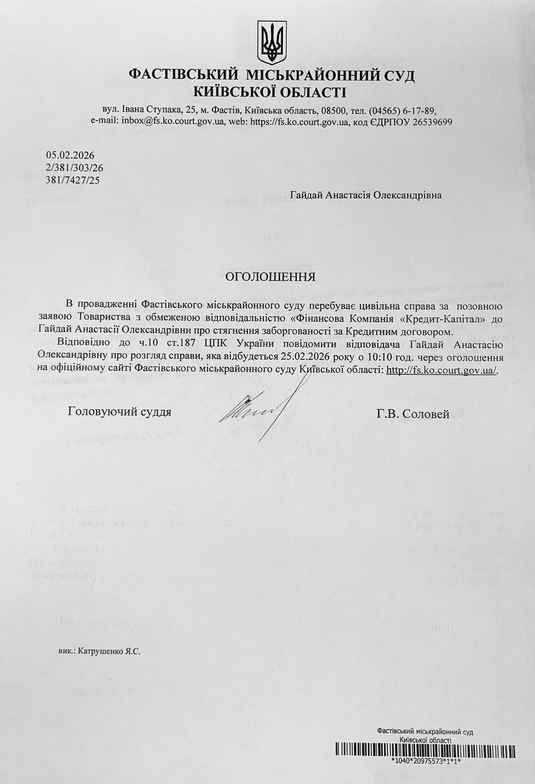 Фастівський міськрайонний суд Київської області викликає Гайдай Анастасію Олександрівну