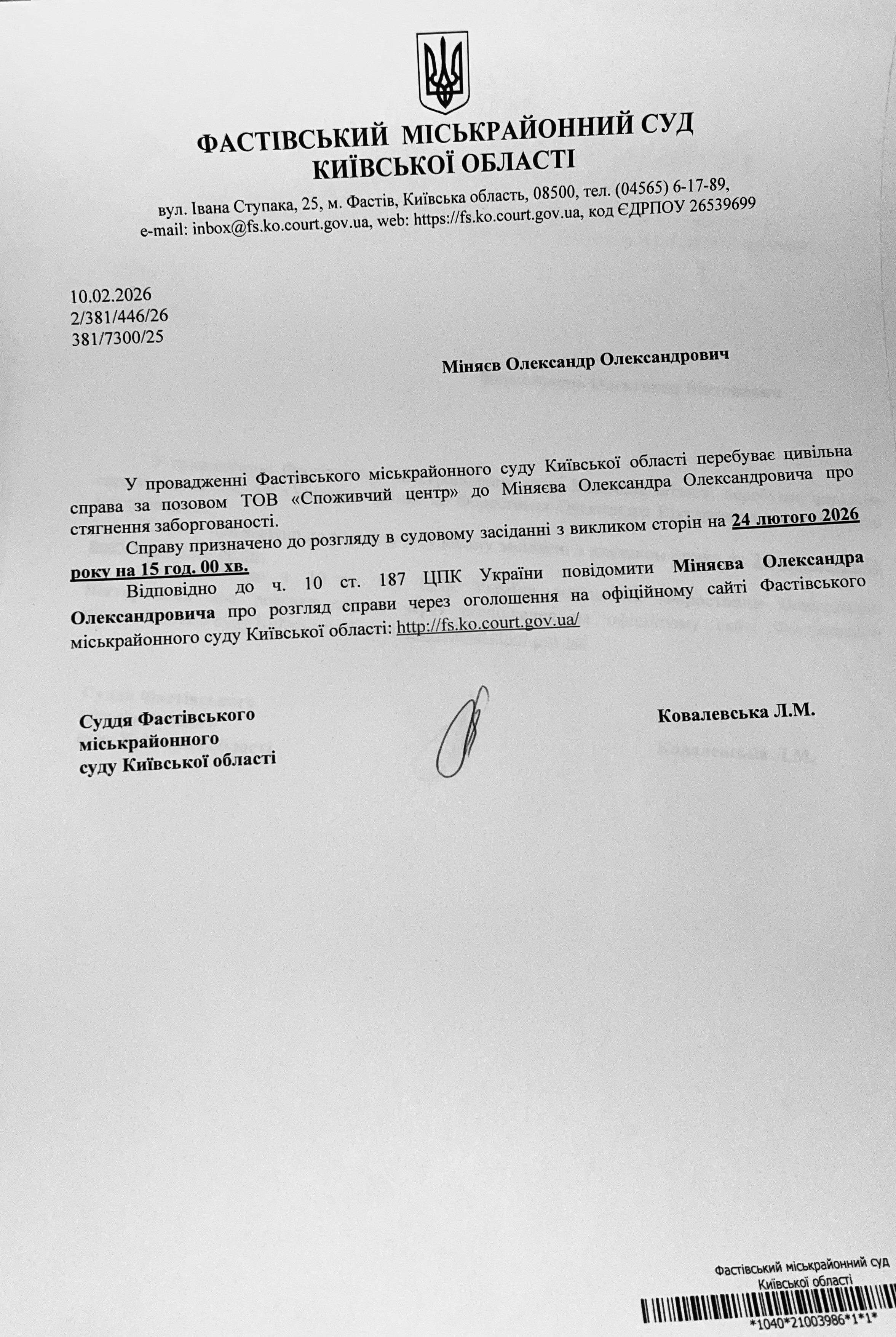 Фастівський міськрайонний суд Київської області викликає Міняєва Олександра Олександровича