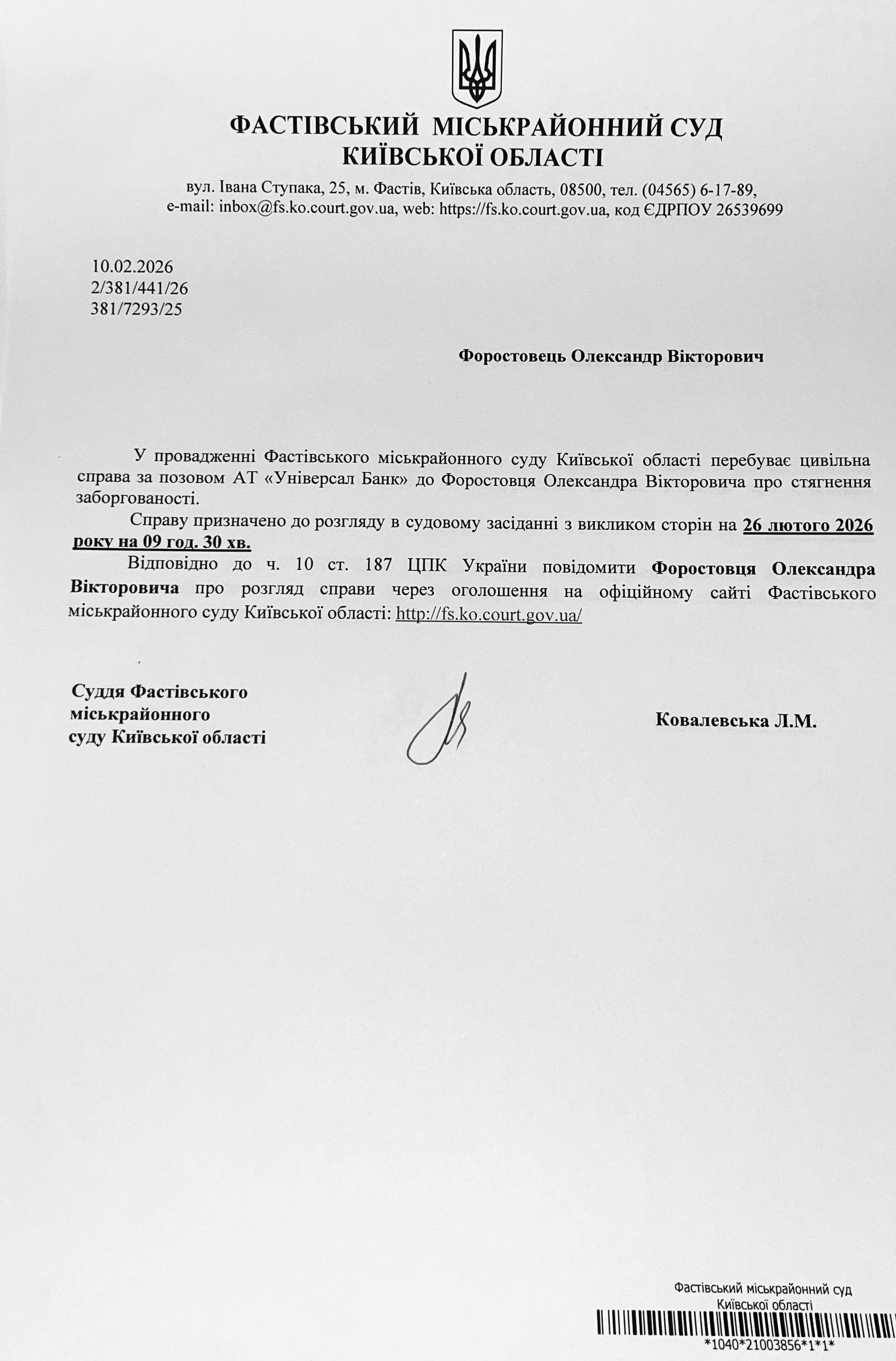 Фастівський міськрайонний суд Київської області викликає Форостовець Олександра Вікторовича
