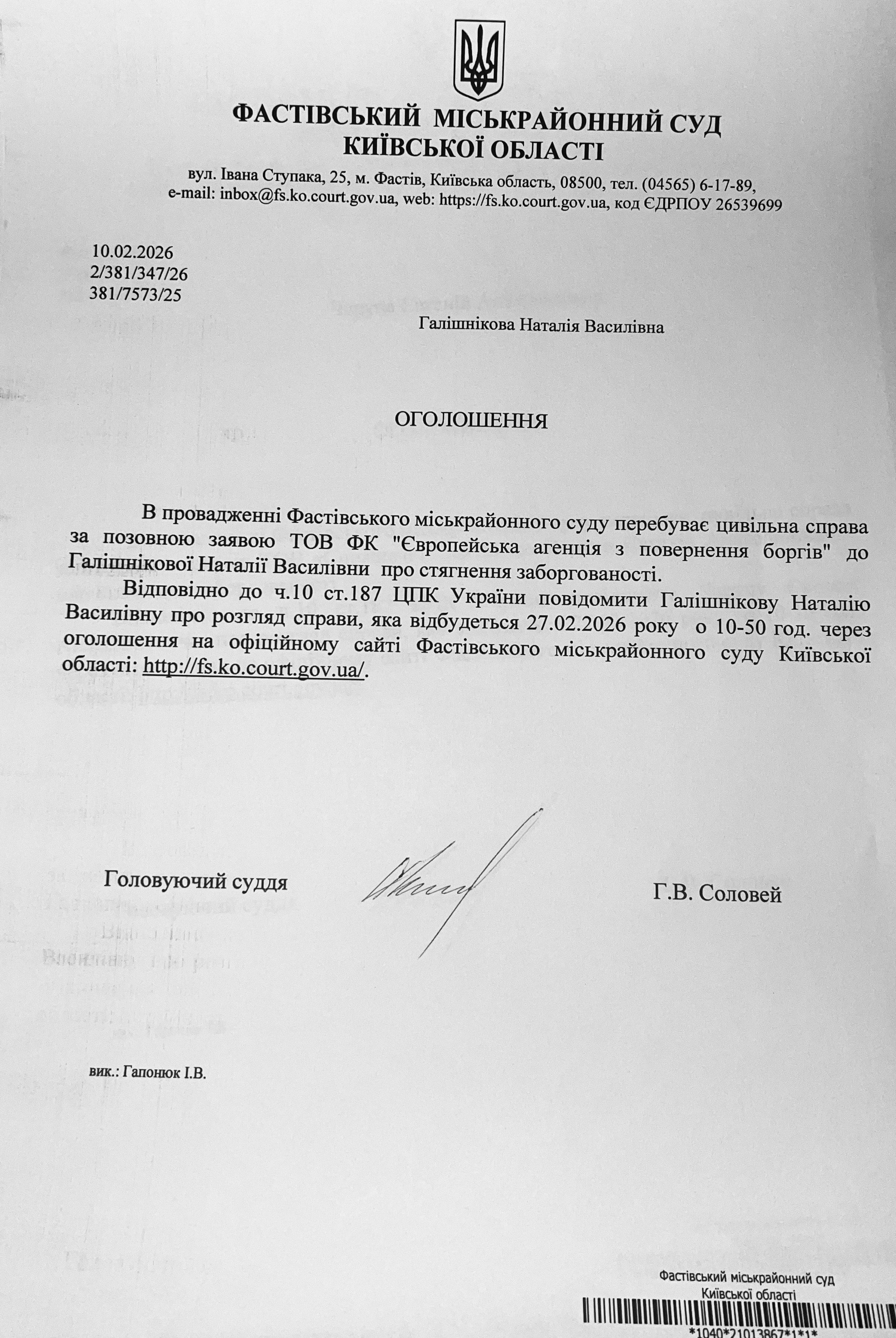 Фастівський міськрайонний суд Київської області викликає Галішнікову Наталію Василівну