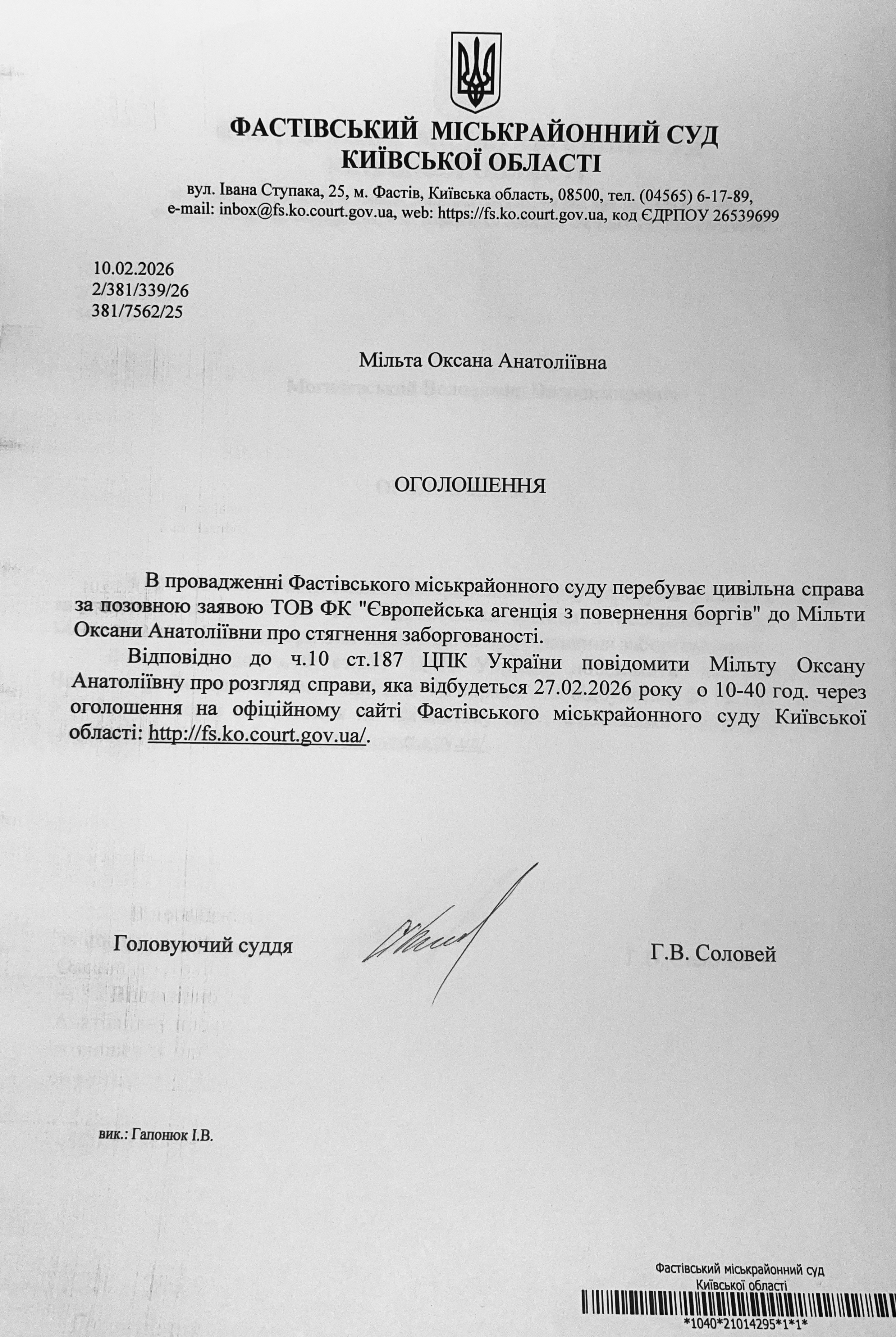Фастівський міськрайонний суд Київської області викликає Мільту Оксану Анатоліївну