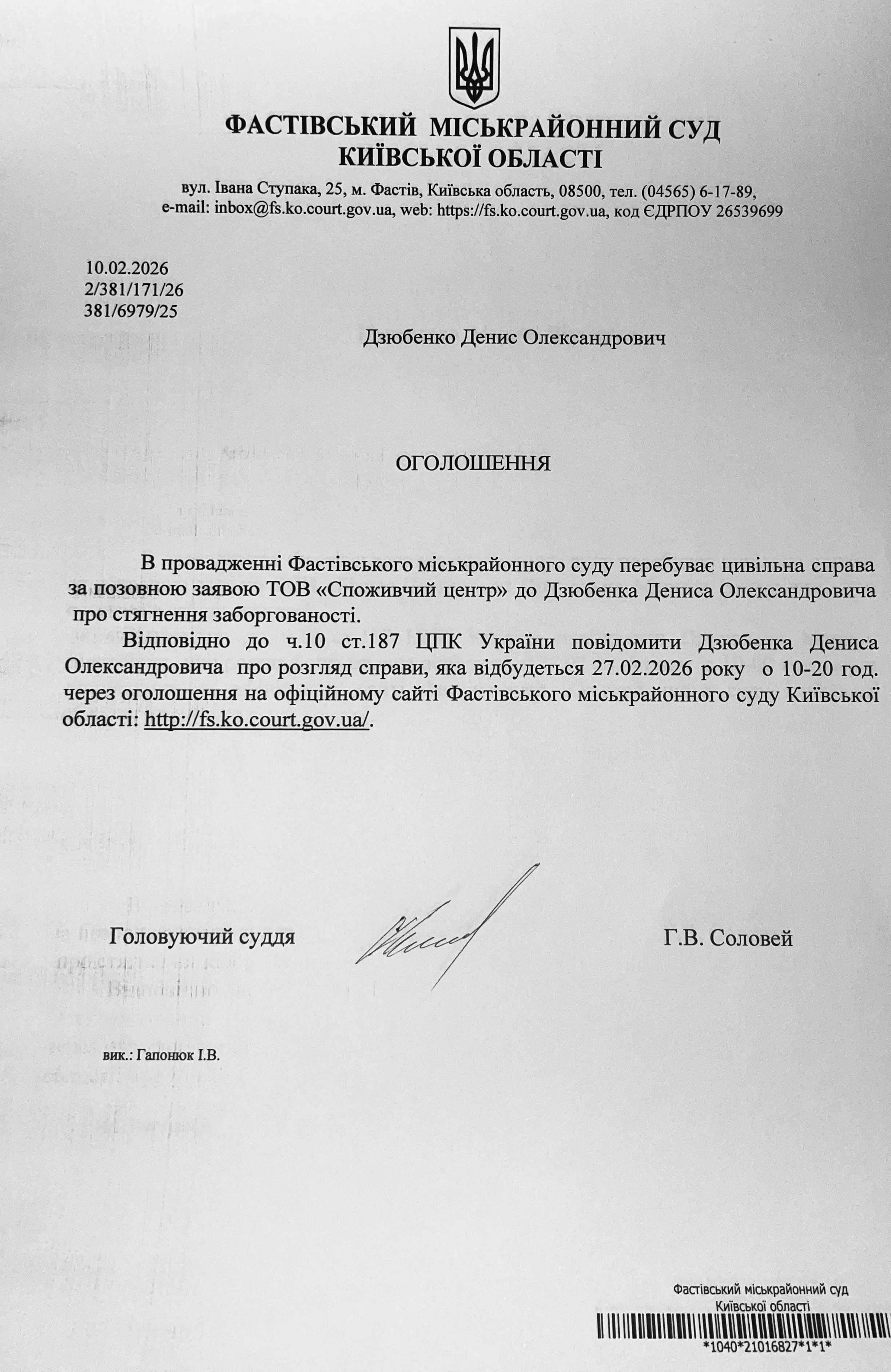 Фастівський міськрайонний суд Київської області викликає Дзюбенка Дениса Олександровича
