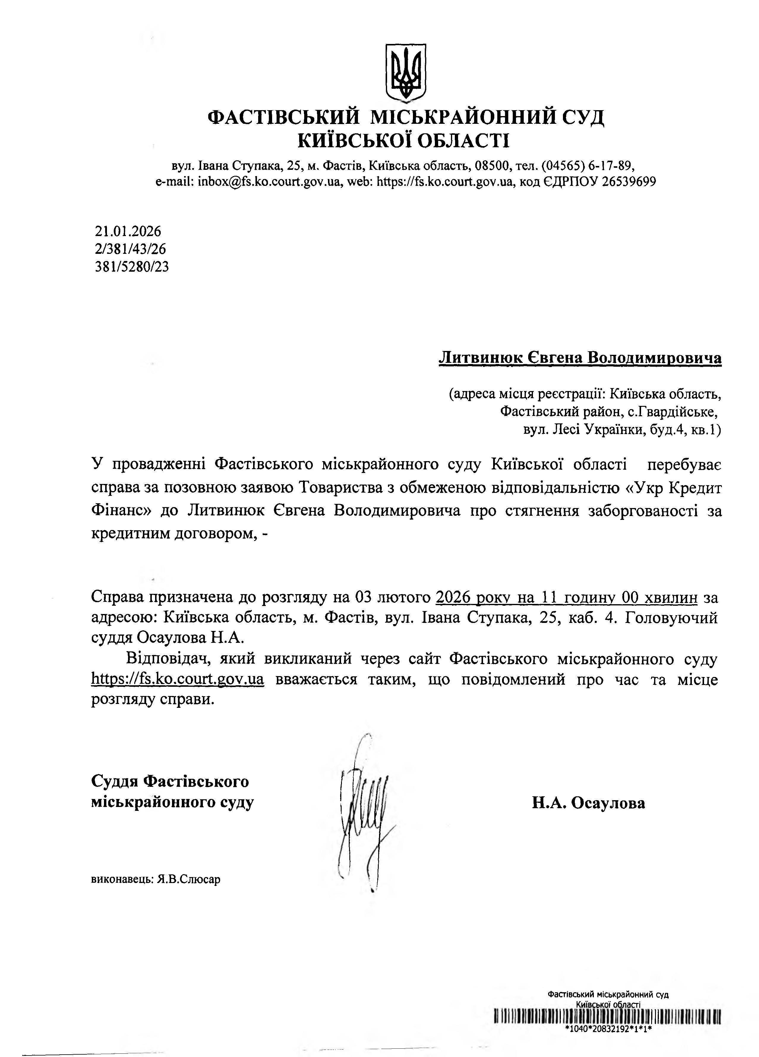 Литвинюк Євгена Володимировича (адреса місця реєстрації: Київська область, Фастівський район, с.Гвардійське, вул. Лесі Українки, буд.4, кв.1)
