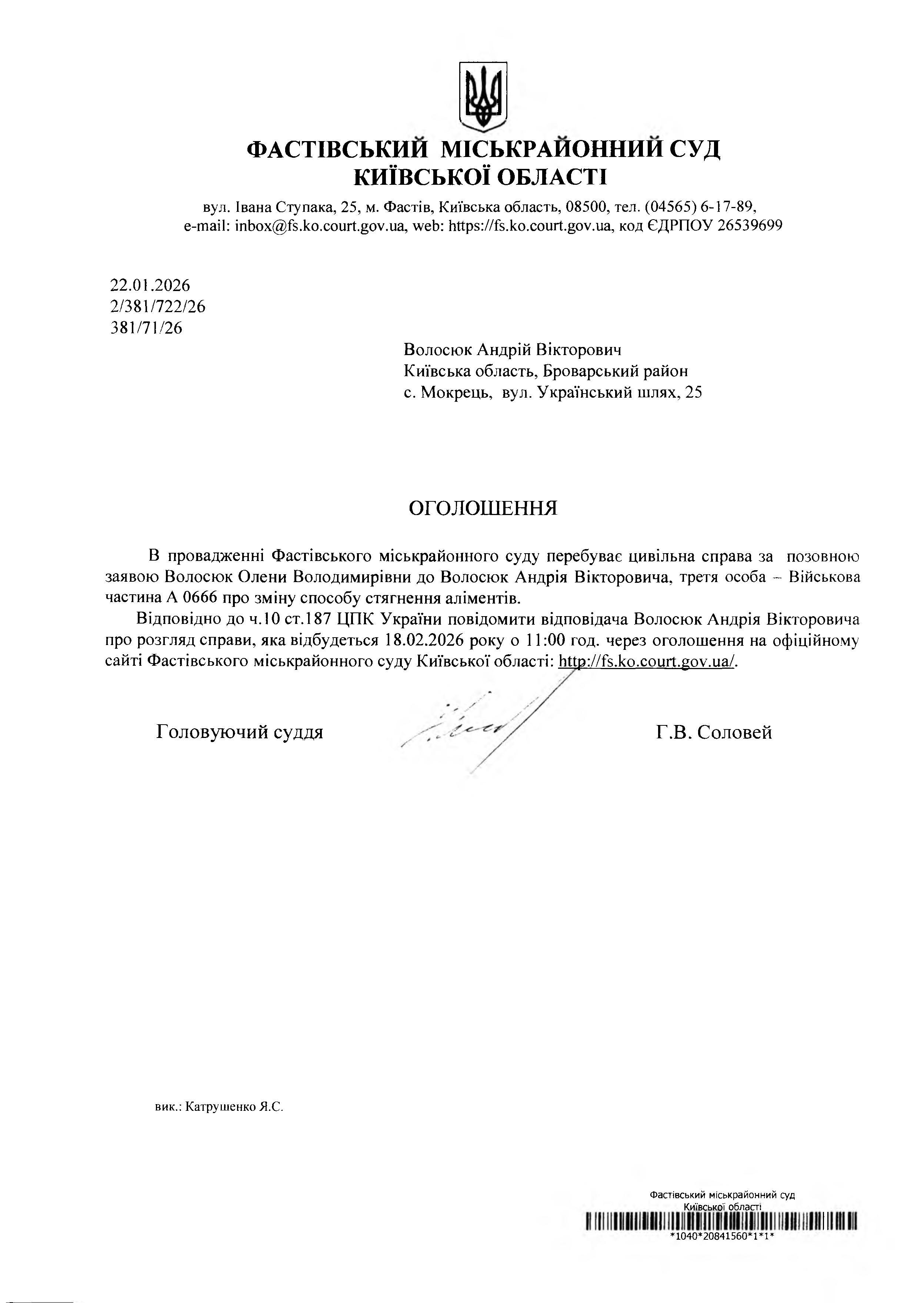 Волосюк Андрій Вікторович Київська область, Броварський район с. Мокрець, вул. Український шлях, 25