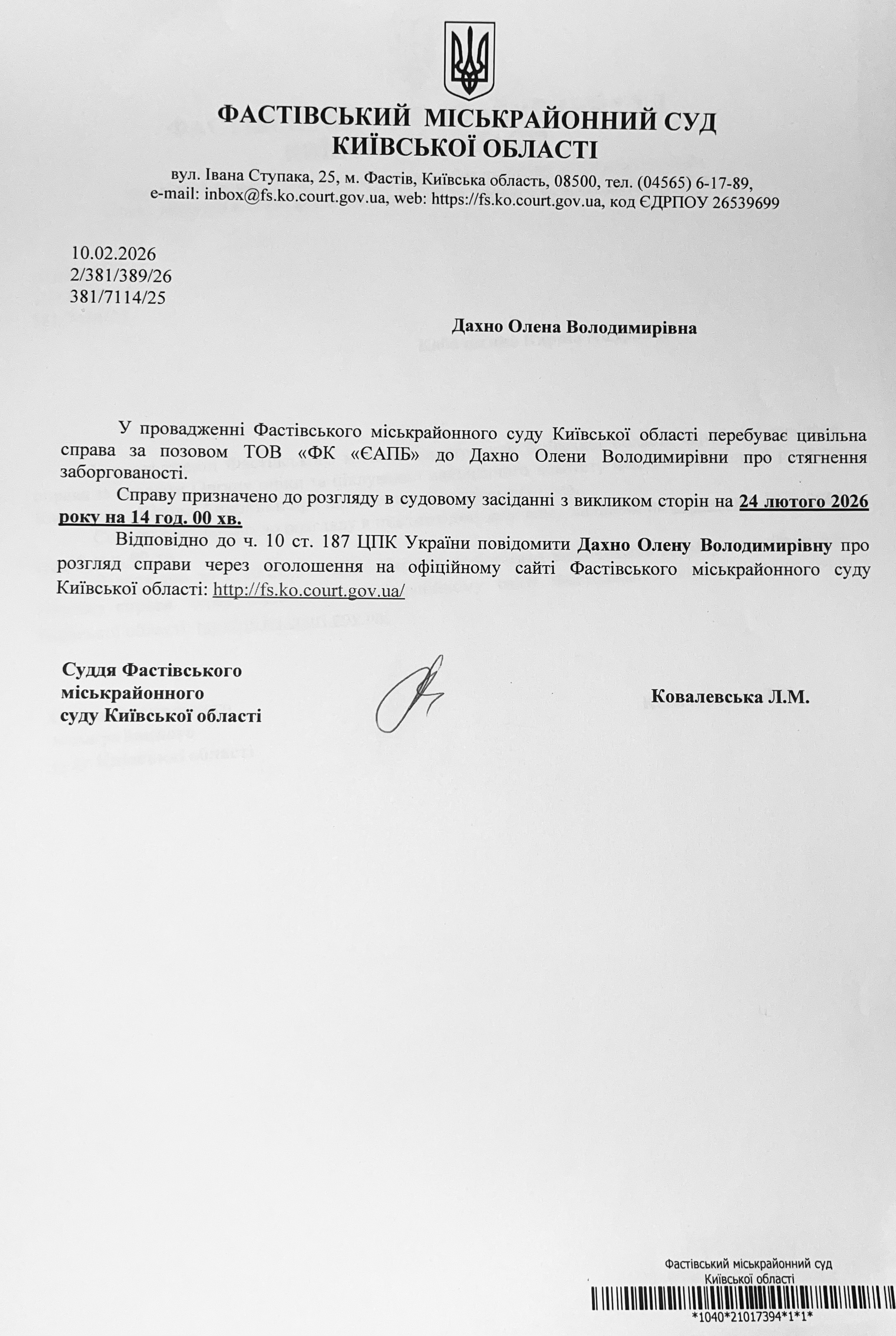 Фастівський міськрайонний суд Київської області викликає Дахно Олену Володимирівну