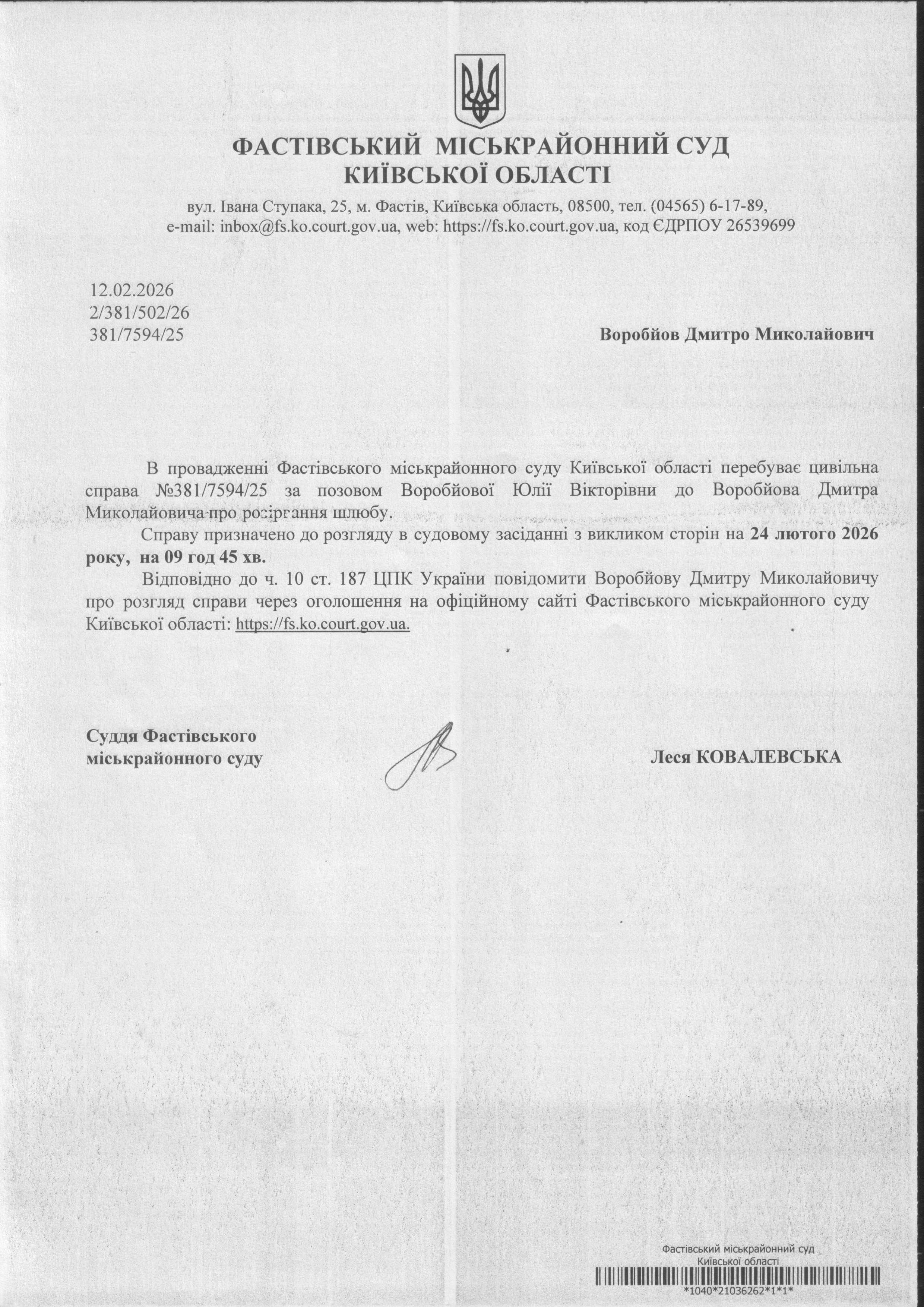 Фастівський міськрайонний суд Київської області викликає Воробйова Дмитра Миколайовича