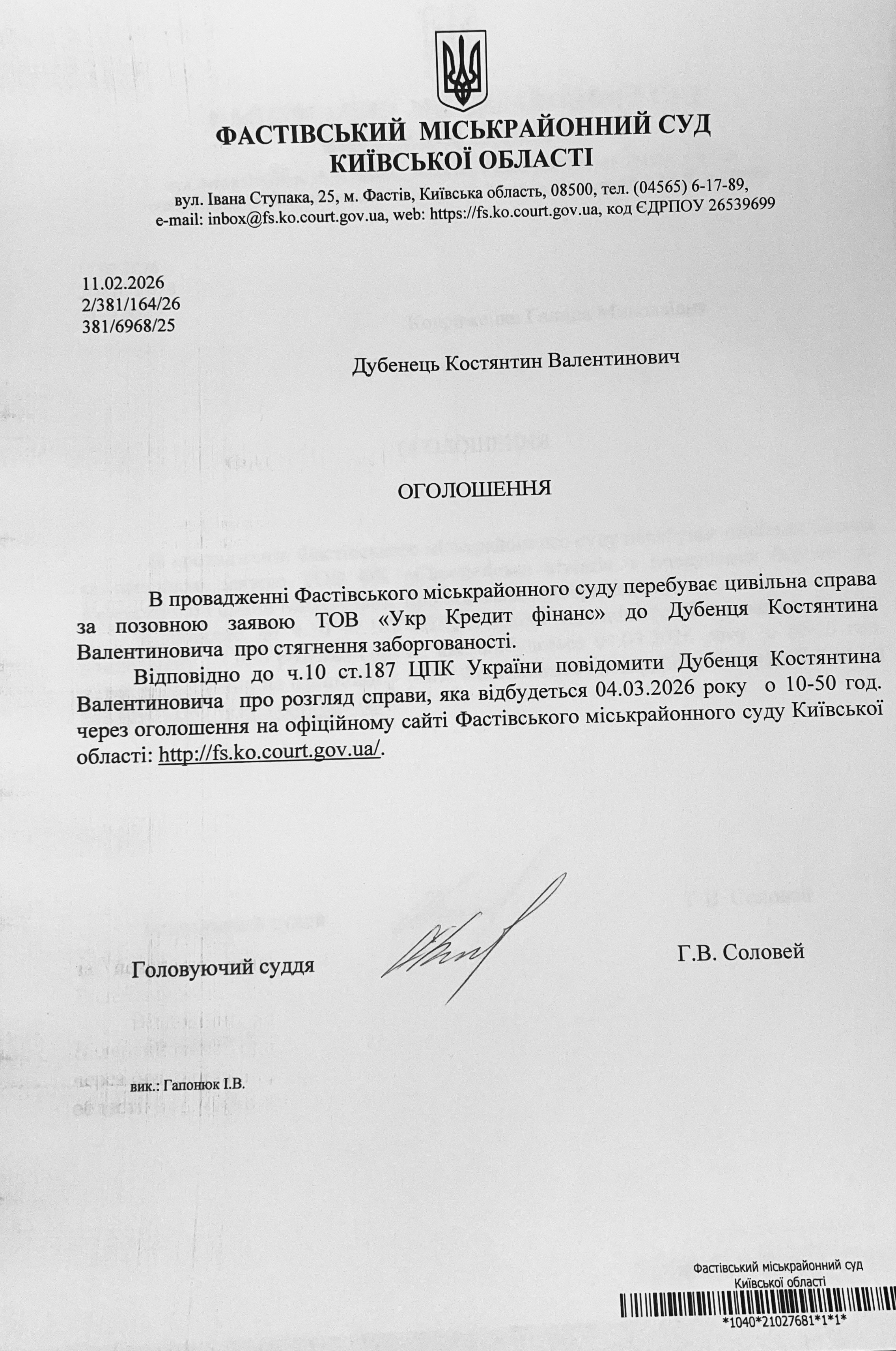 Фастівський міськрайонний суд Київської області викликає Дубенець Костянтина Валентиновича