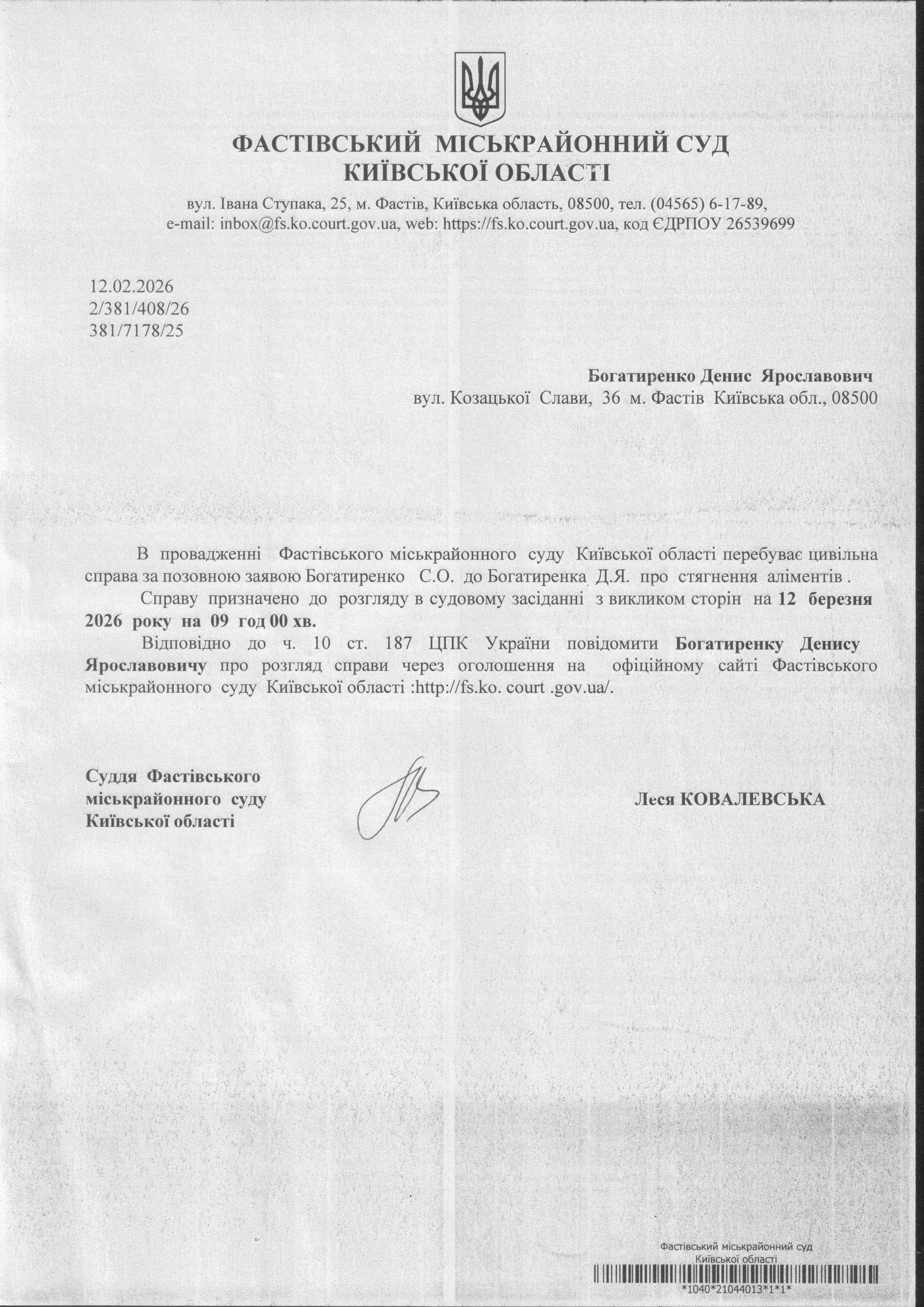 Фастівський міськрайонний суд Київської області викликає Богатиренка Дениса Ярославовича