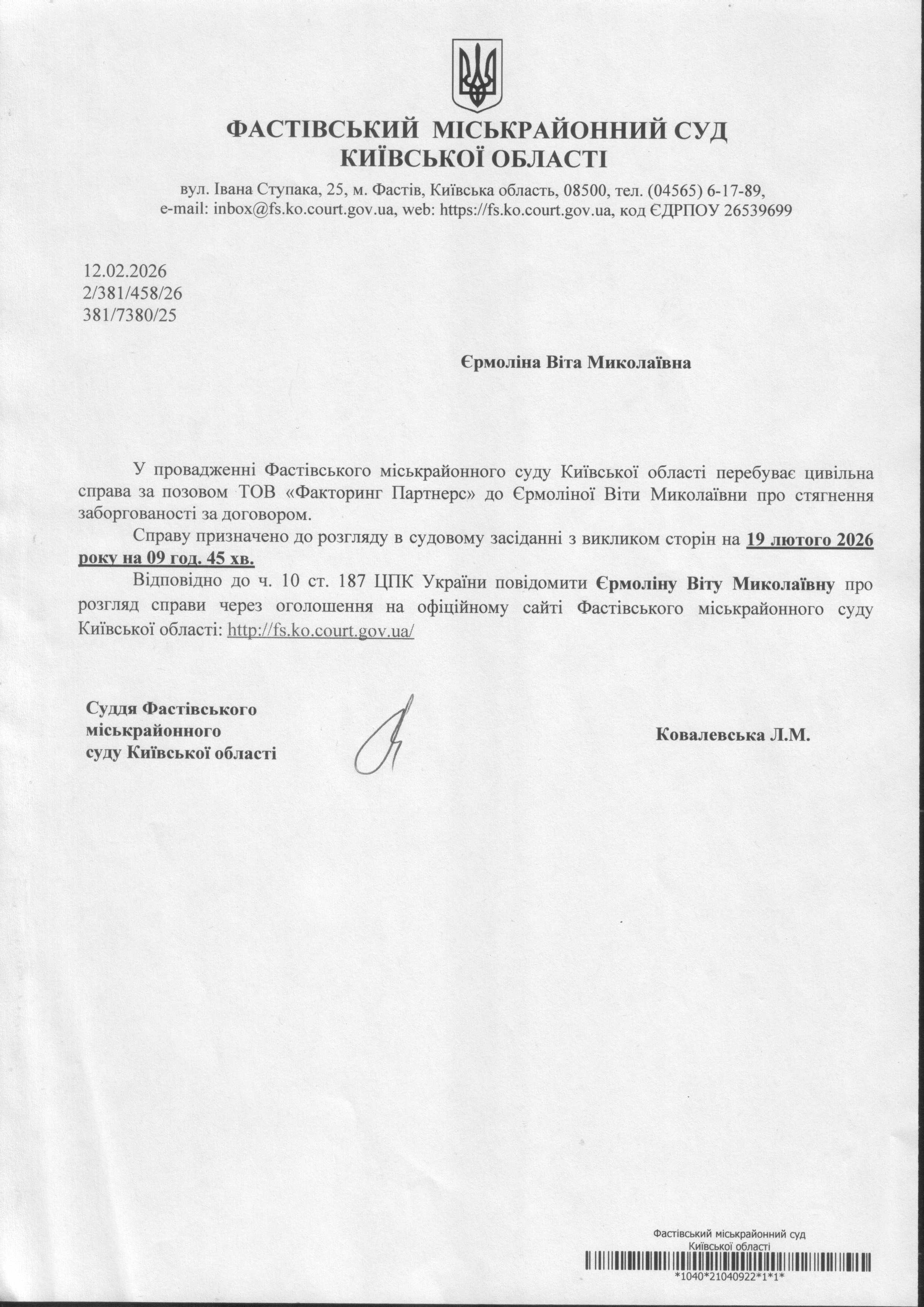 Фастівський міськрайонний суд Київської області викликає Єрмоліну Віту Миколаївну