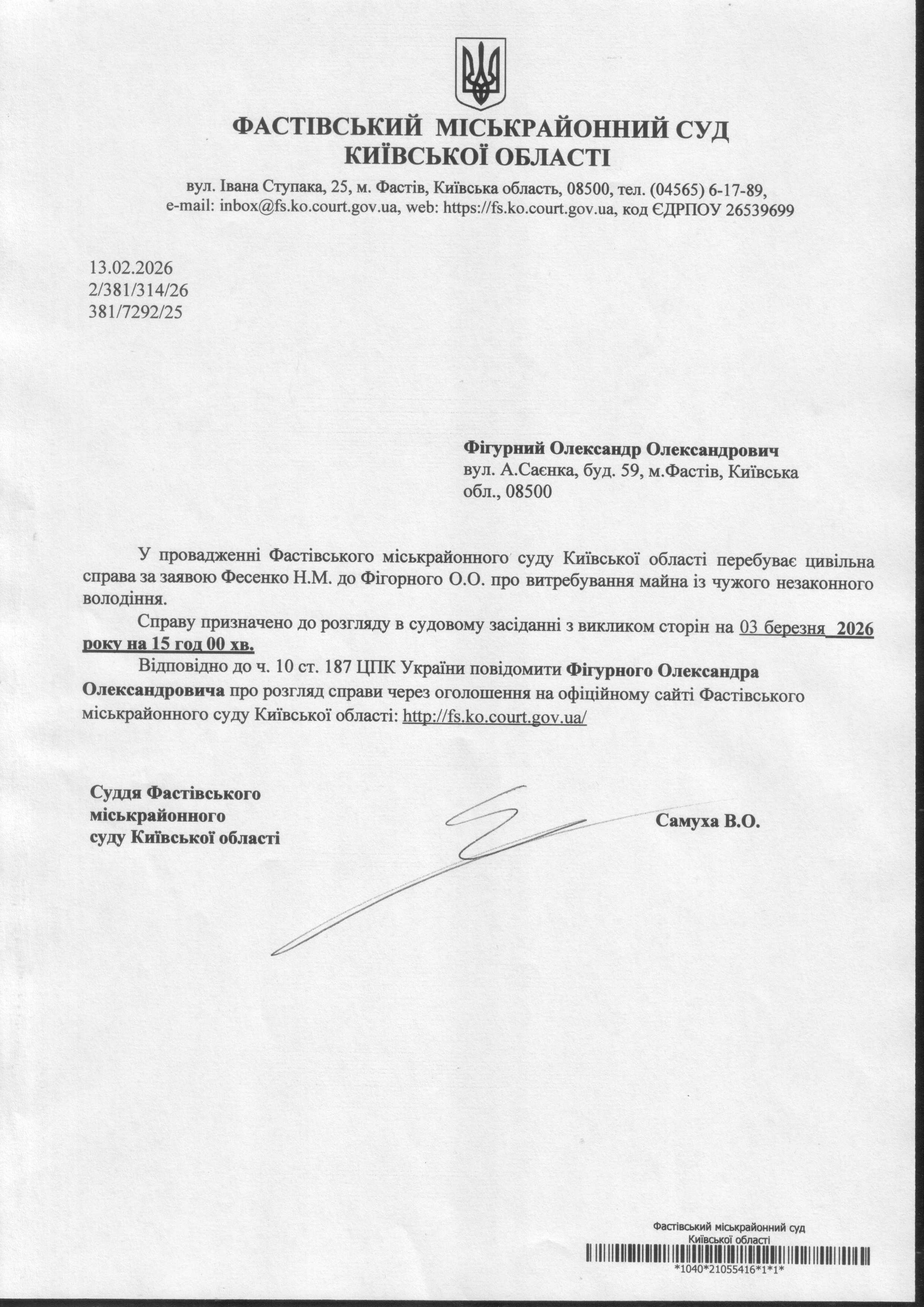 Фастівський міськрайонний суд Київської області викликає Фігурного Олександра Олександровича