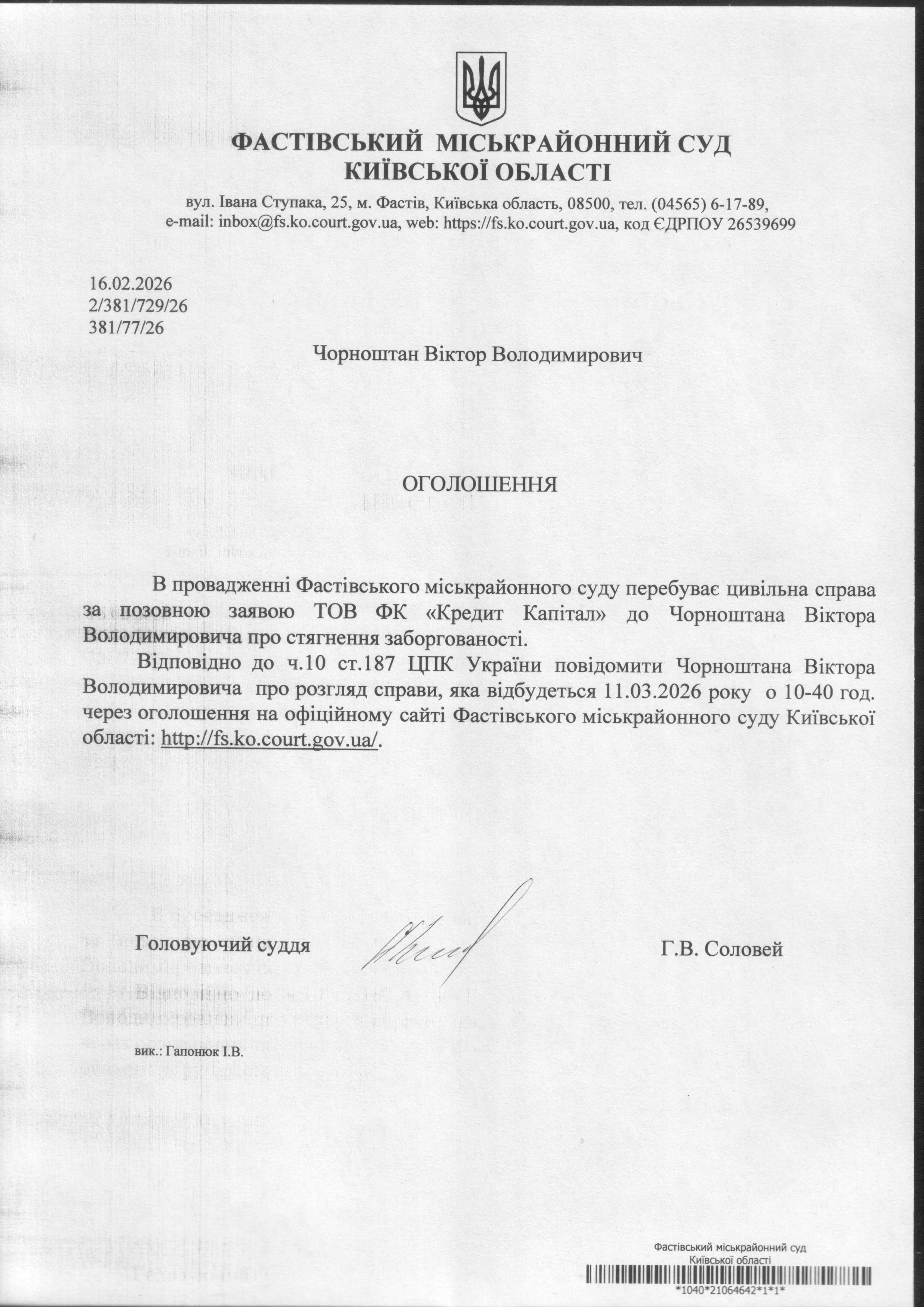 Фастівський міськрайонний суд Київської області викликає Чорноштан Віктора Володимировича