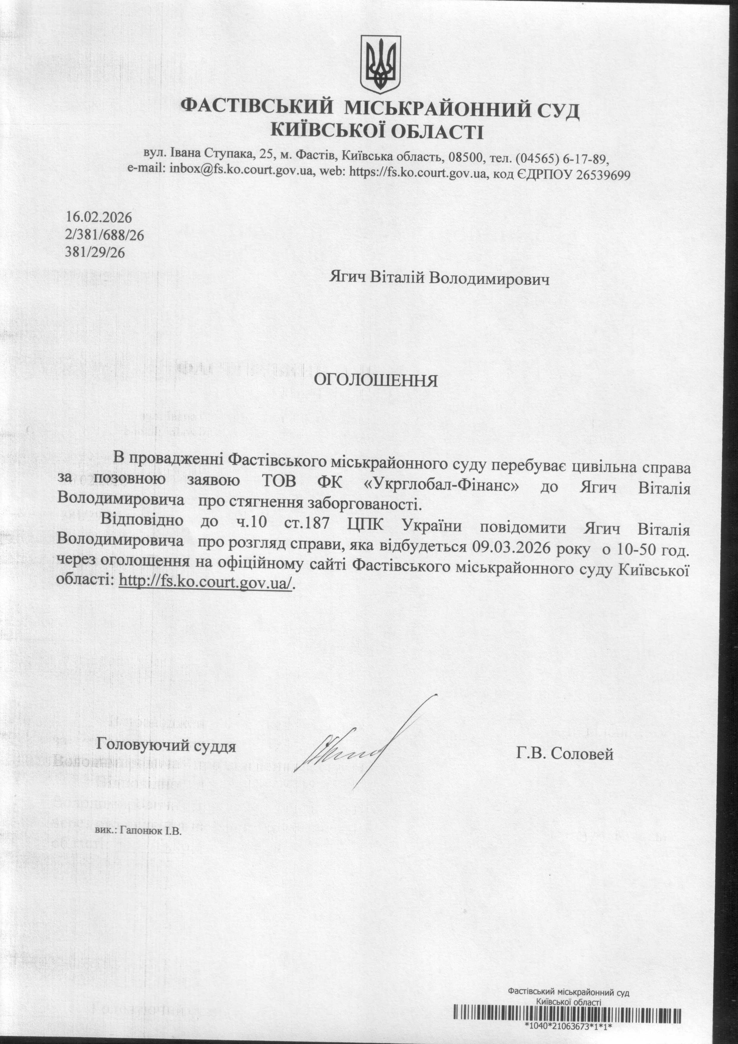 Фастівський міськрайонний суд Київської області викликає Ягича Віталія Володимировича