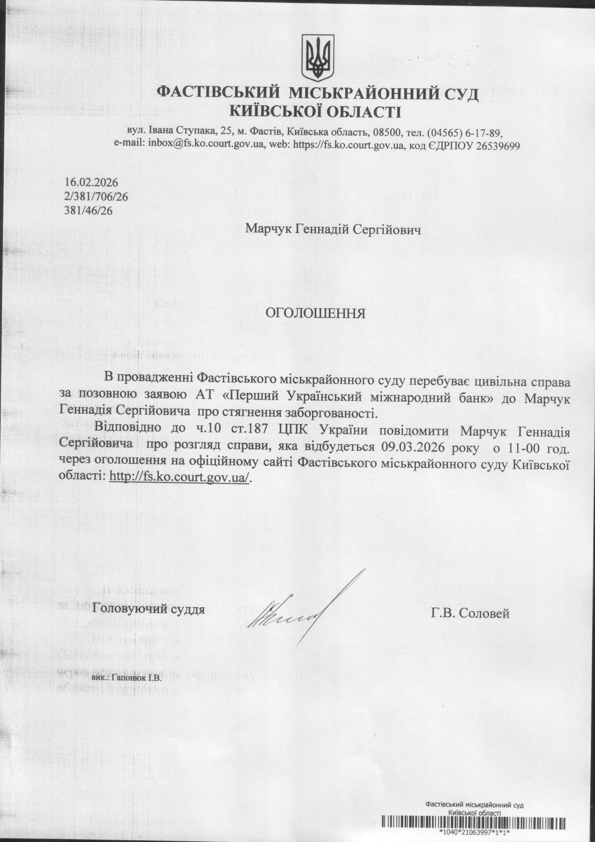 Фастівський міськрайонний суд Київської області викликає Марчука Геннадія Сергійовича
