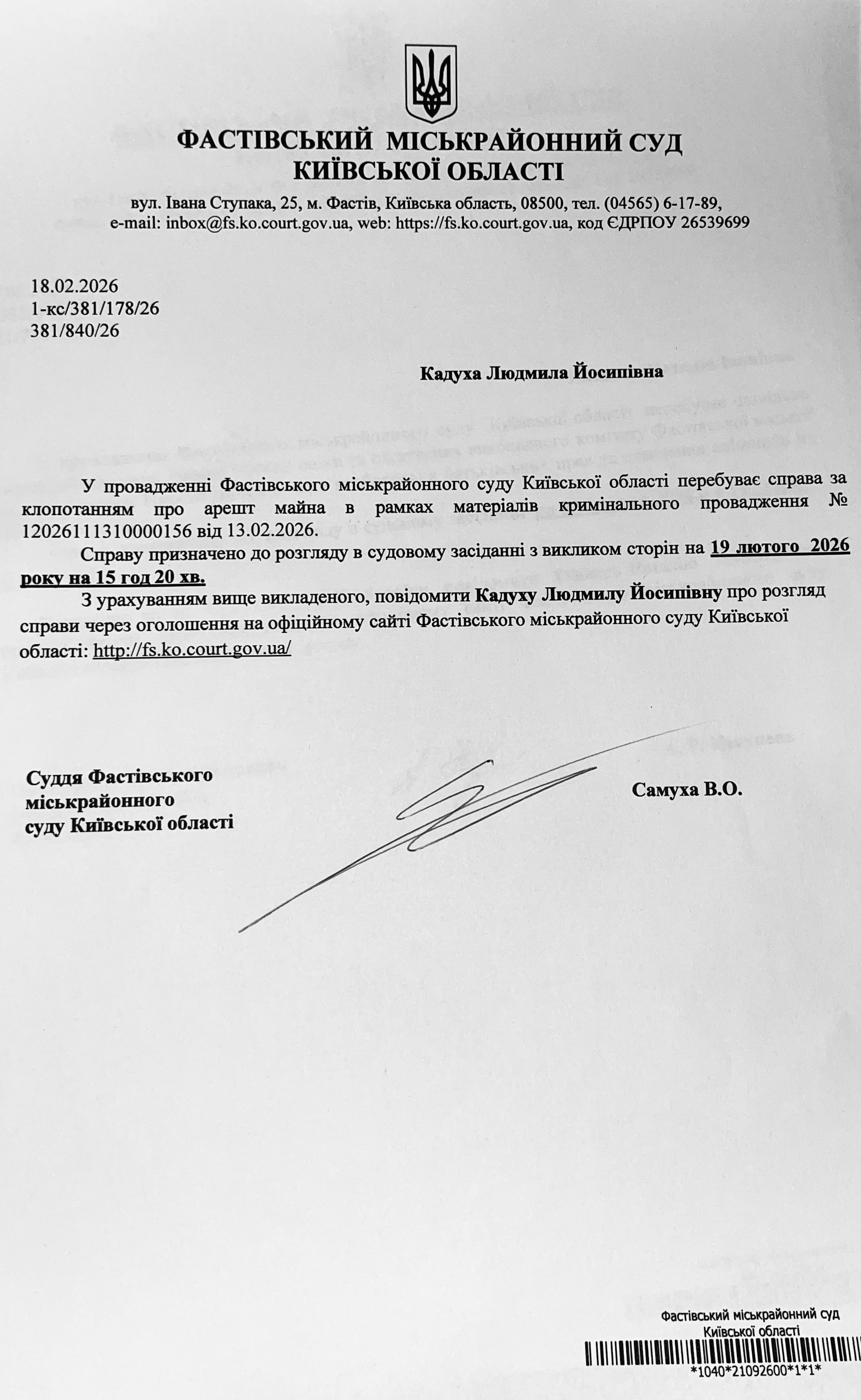 Фастівський міськрайонний суд Київської області викликає Кадуху Людмилу Йосипівну