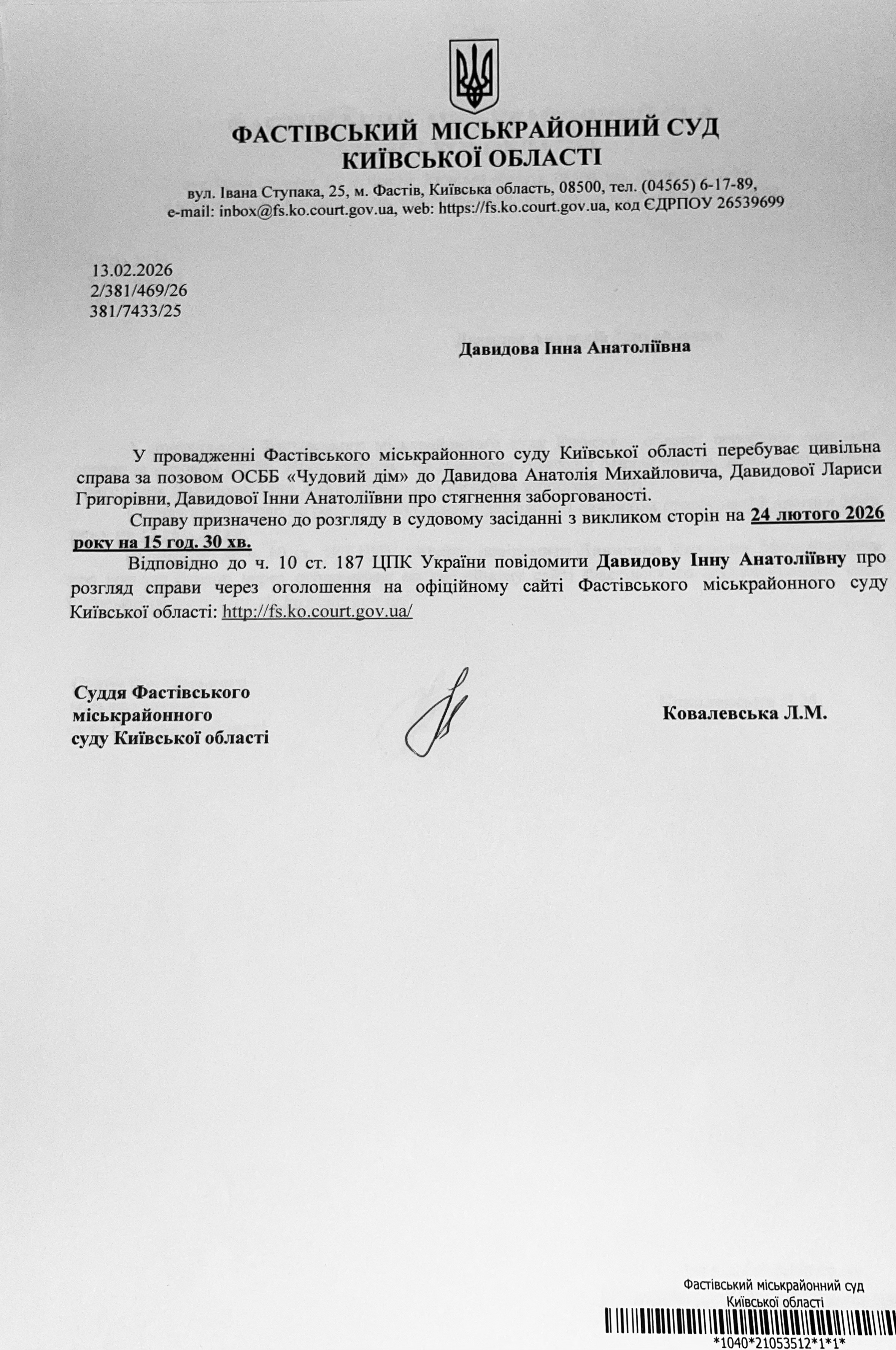Фастівський міськрайонний суд Київської області викликає Давидову Інну Анатоліївну