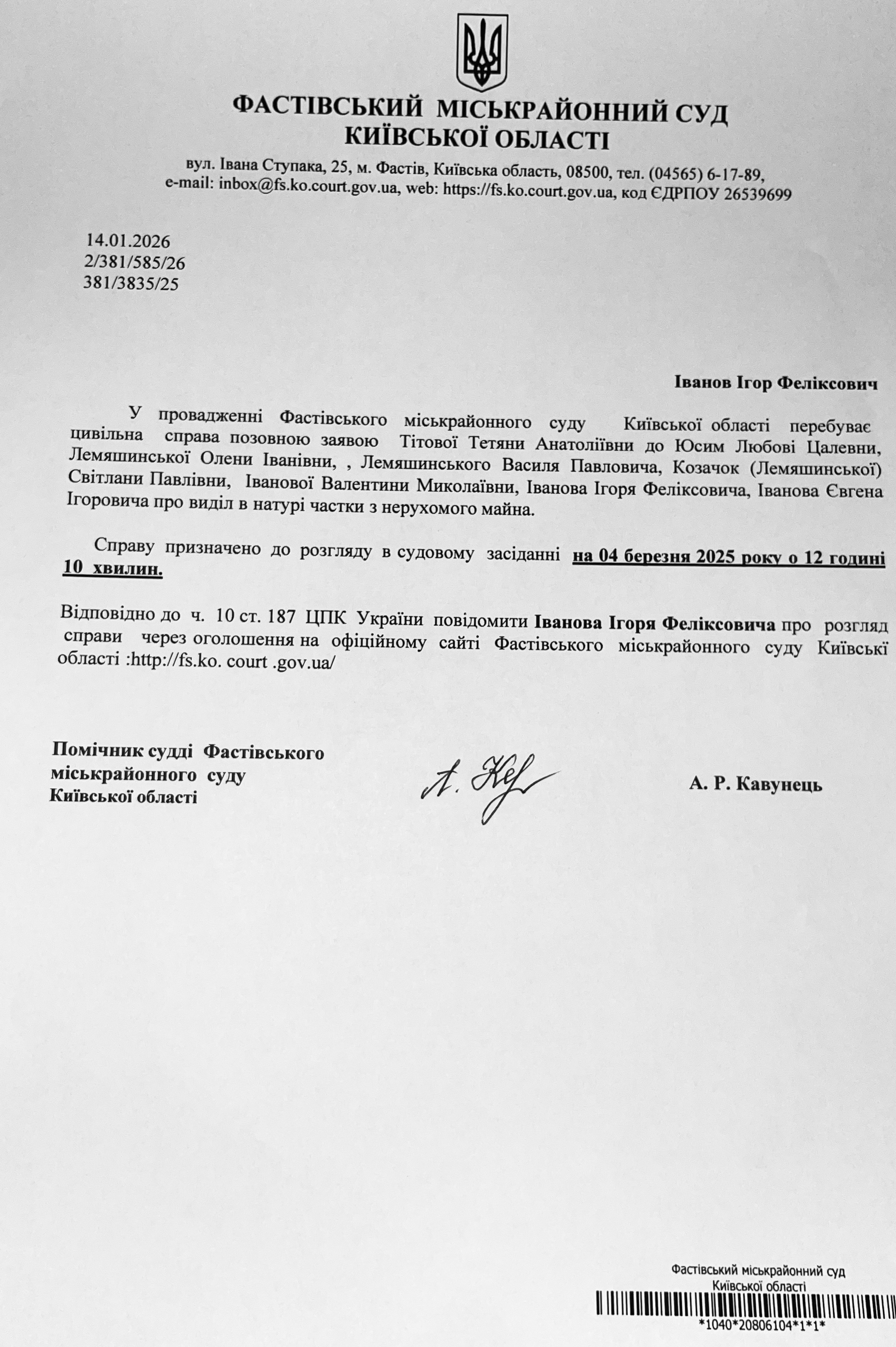 Фастівський міськрайонний суд Київської області викликає Іванова Ігоря Феліксовича