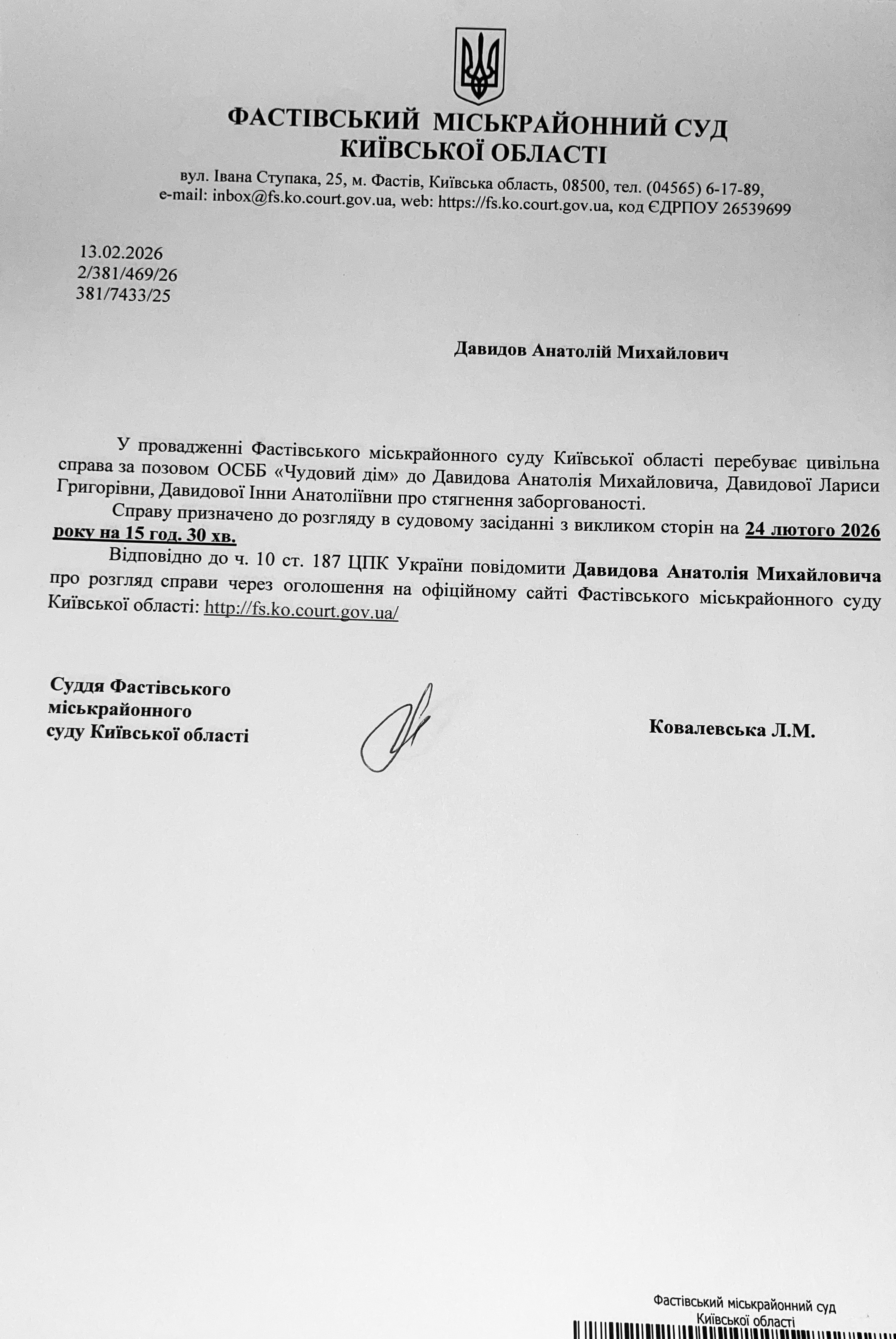 Фастівський міськрайонний суд Київської області викликає Давидова Анатолія Михайловича