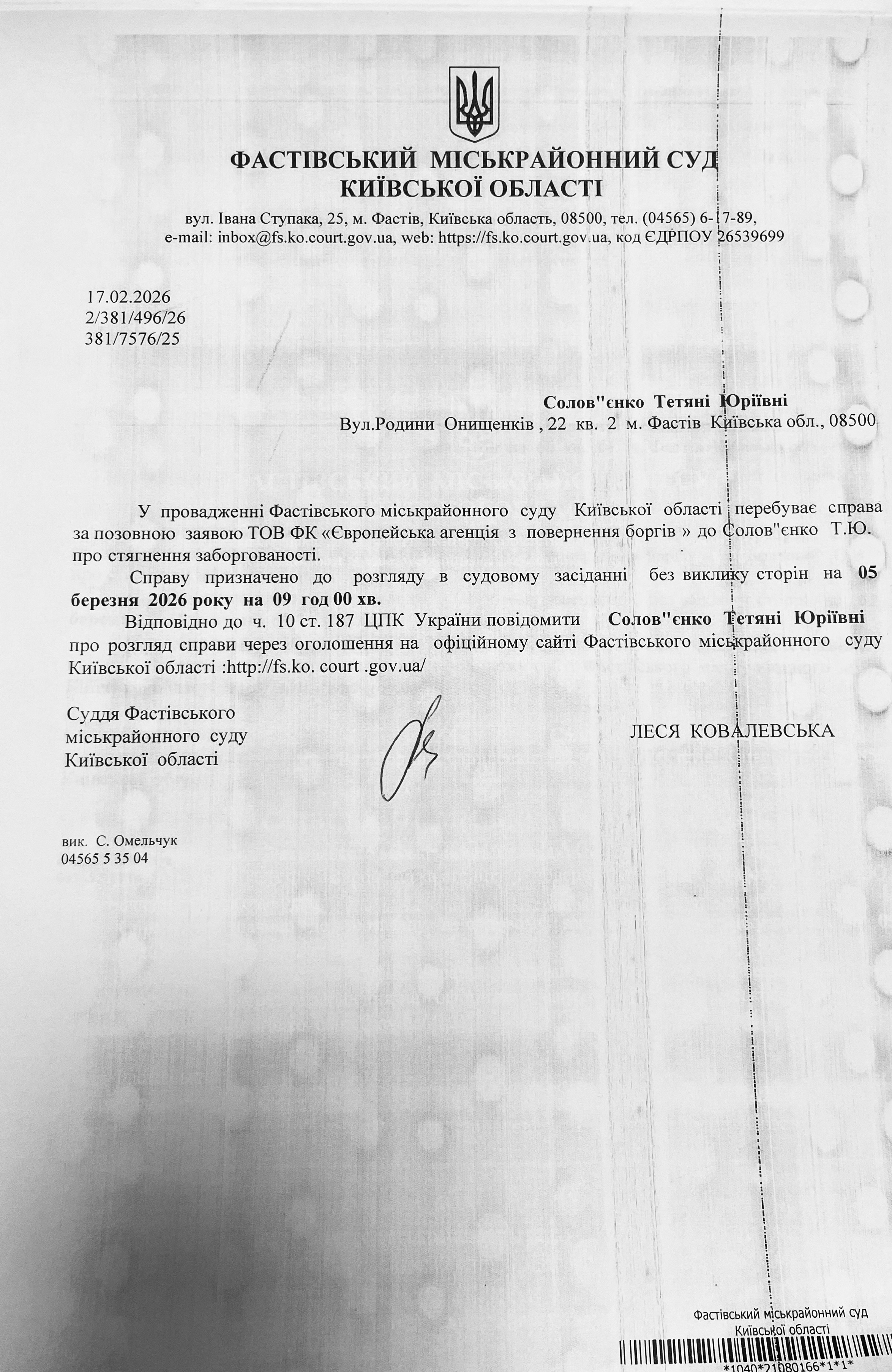 Фастівський міськрайонний суд Київської області викликає Солов'єнко Тетяну Юріївну