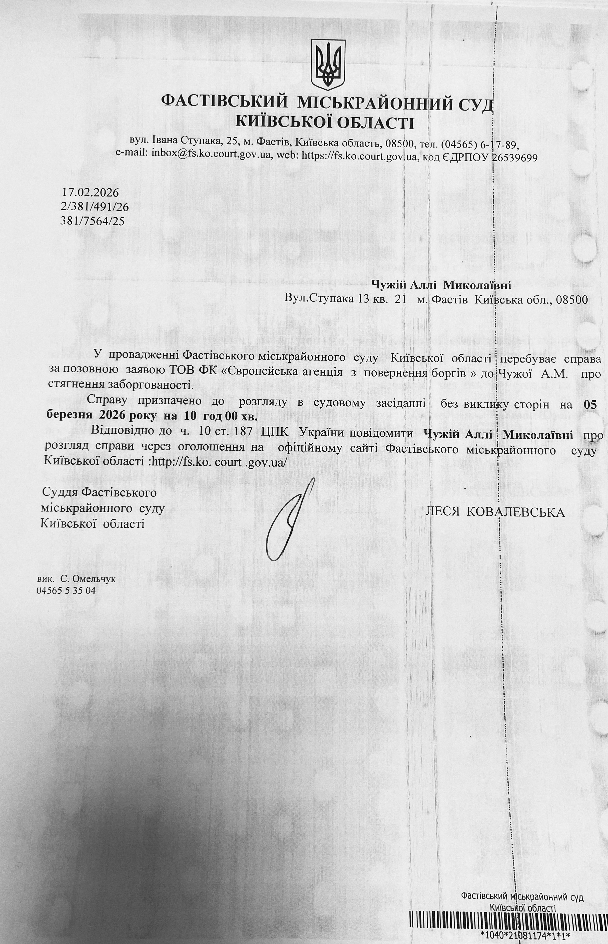 Фастівський міськрайонний суд Київської області викликає Чужу Аллу Миколаївну