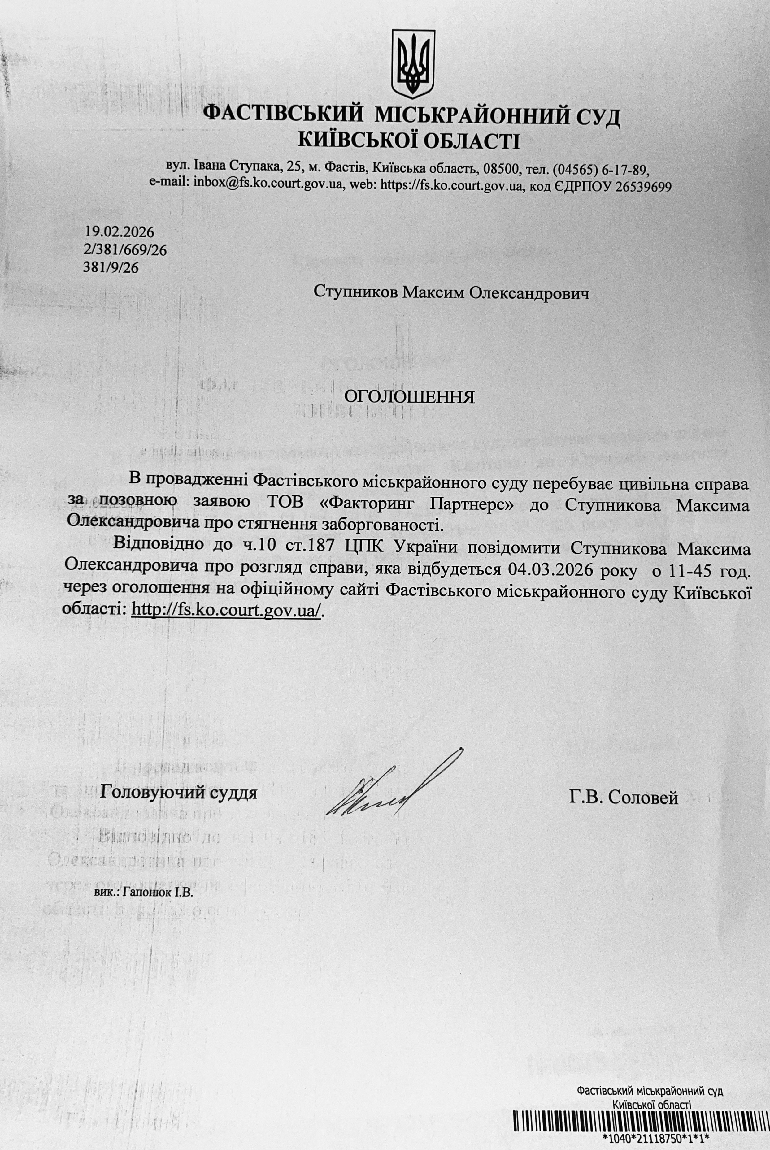 Фастівський міськрайонний суд Київської області викликає Ступникова Максима Олександровича