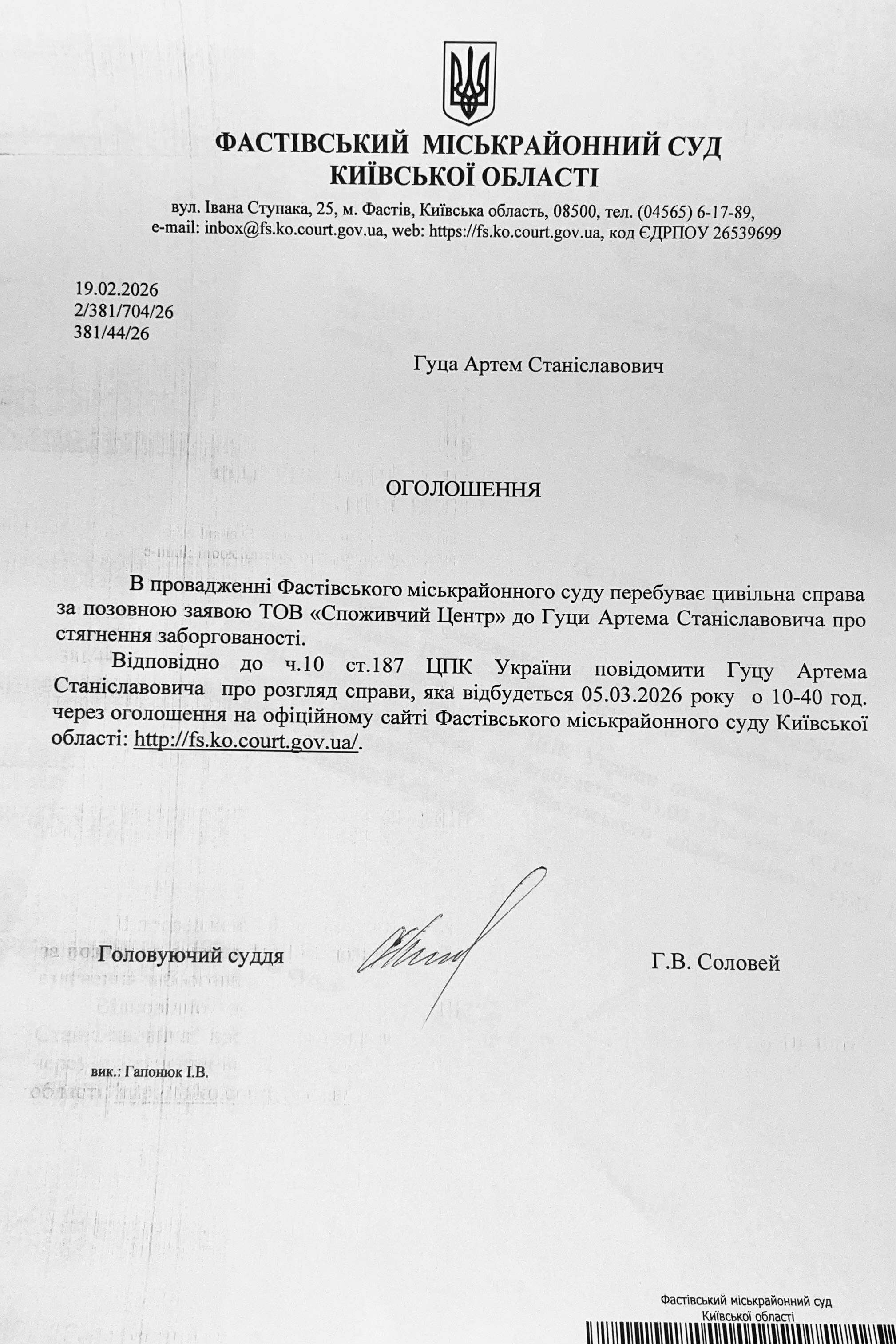 Фастівський міськрайонний суд Київської області викликає Гуца Артема Станіславовича