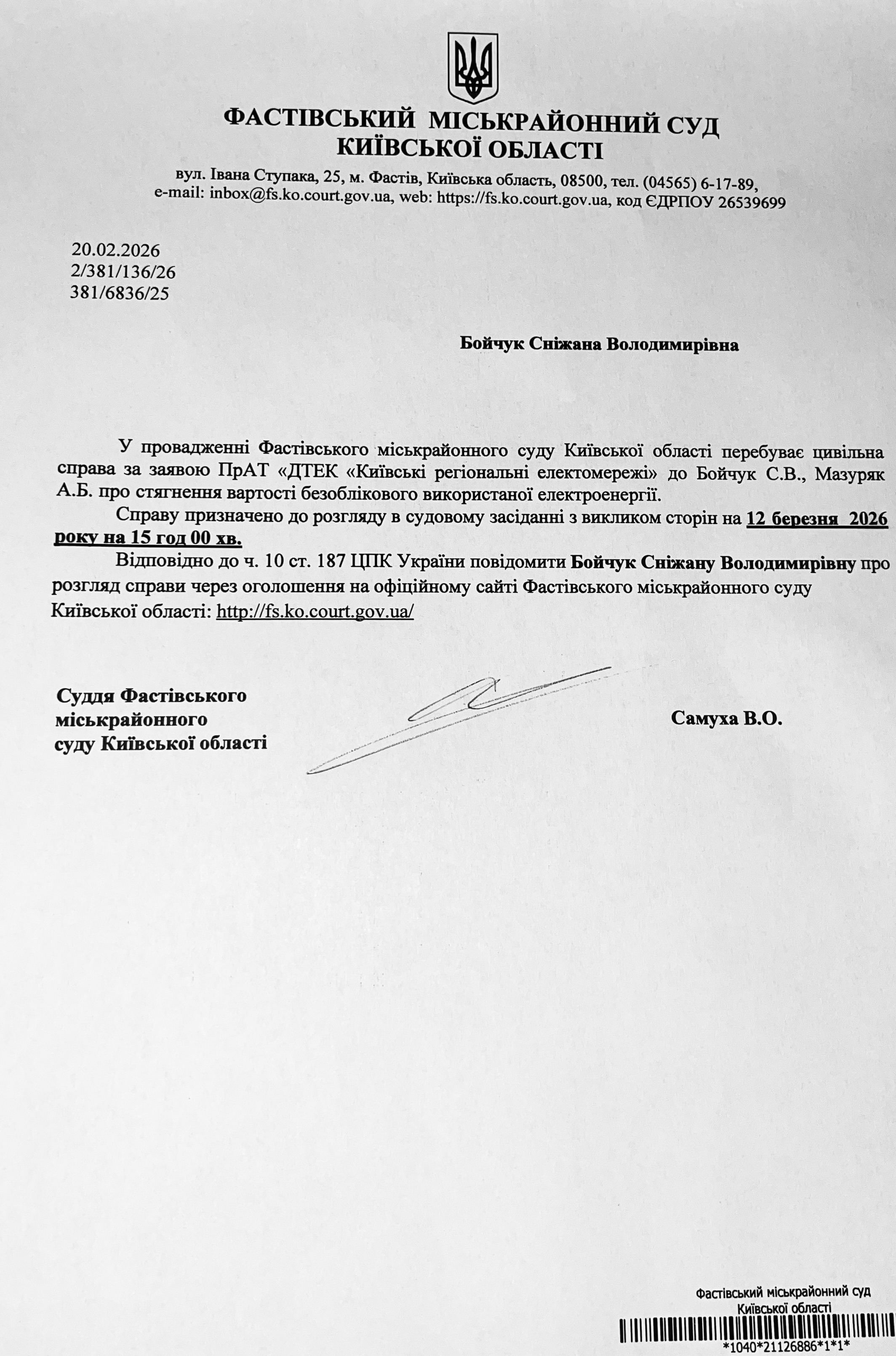 Фастівський міськрайонний суд Київської області викликає Бойчук Сніжану Володимирівну