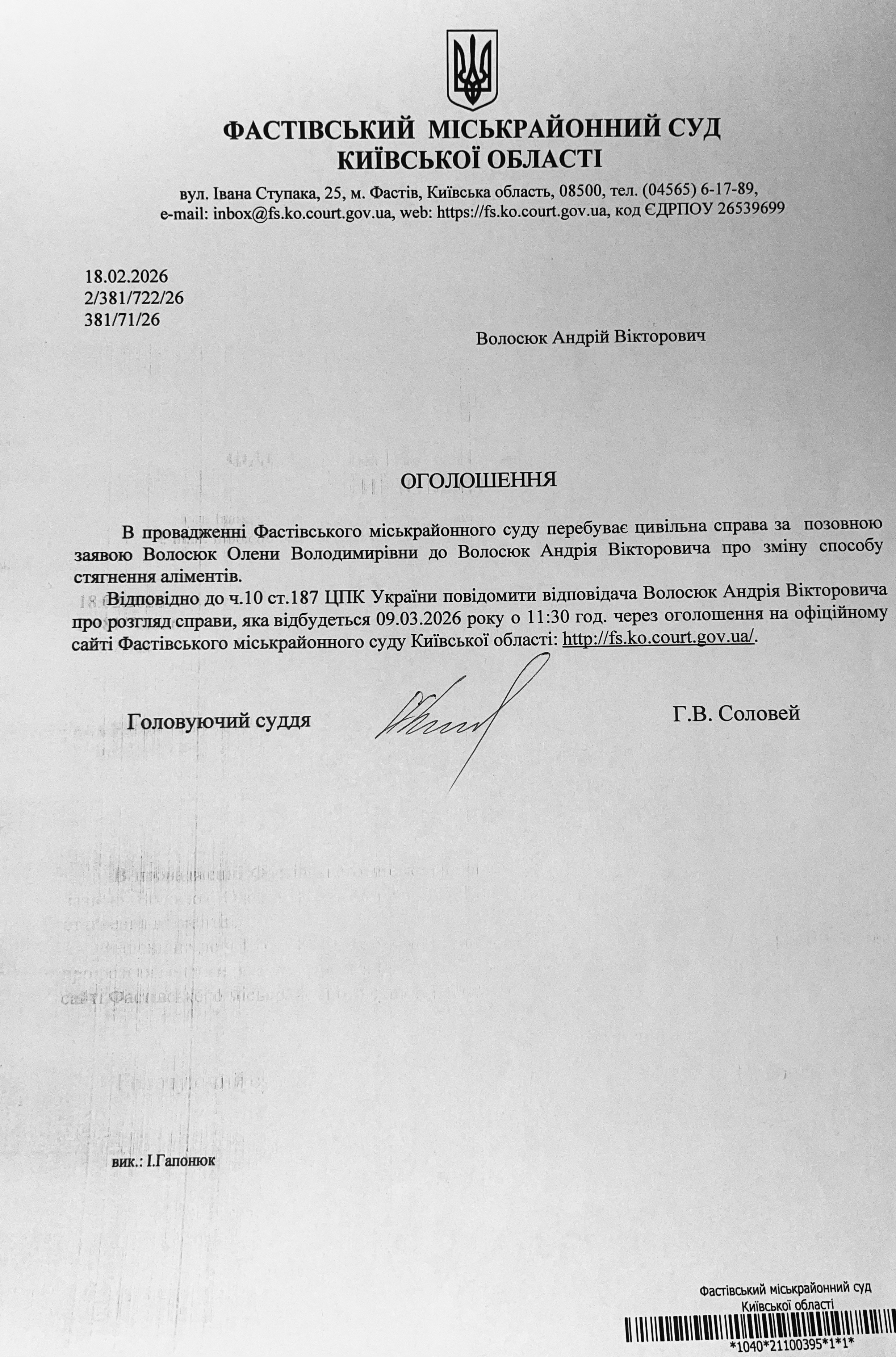 Фастівський міськрайонний суд Київської області викликає Волосюк Андрія Вікторовича