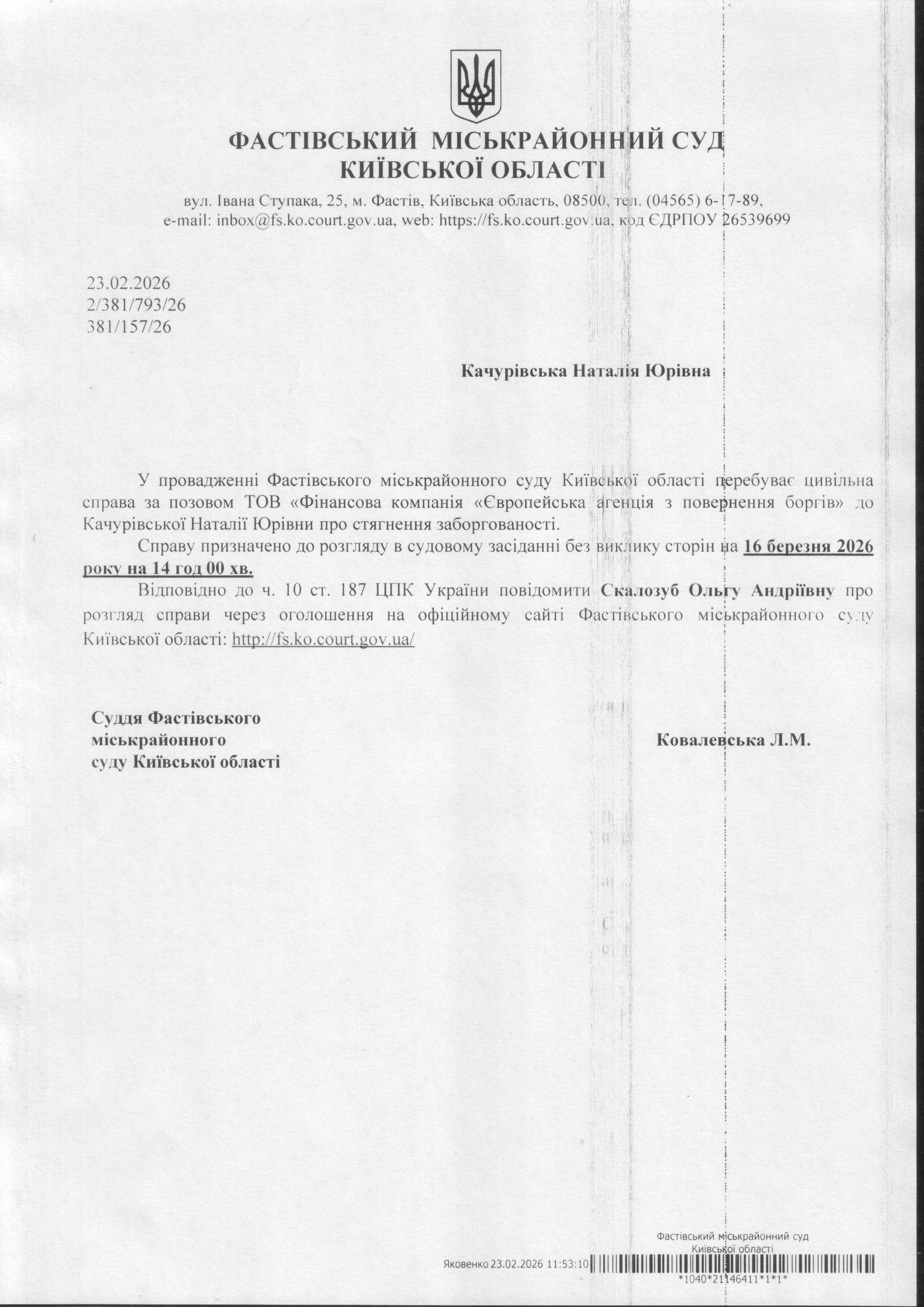 Фастівський міськрайонний суд Київської області викликає Качурівську Наталію Юрівну, Скалозуб Ольгу Андріївну