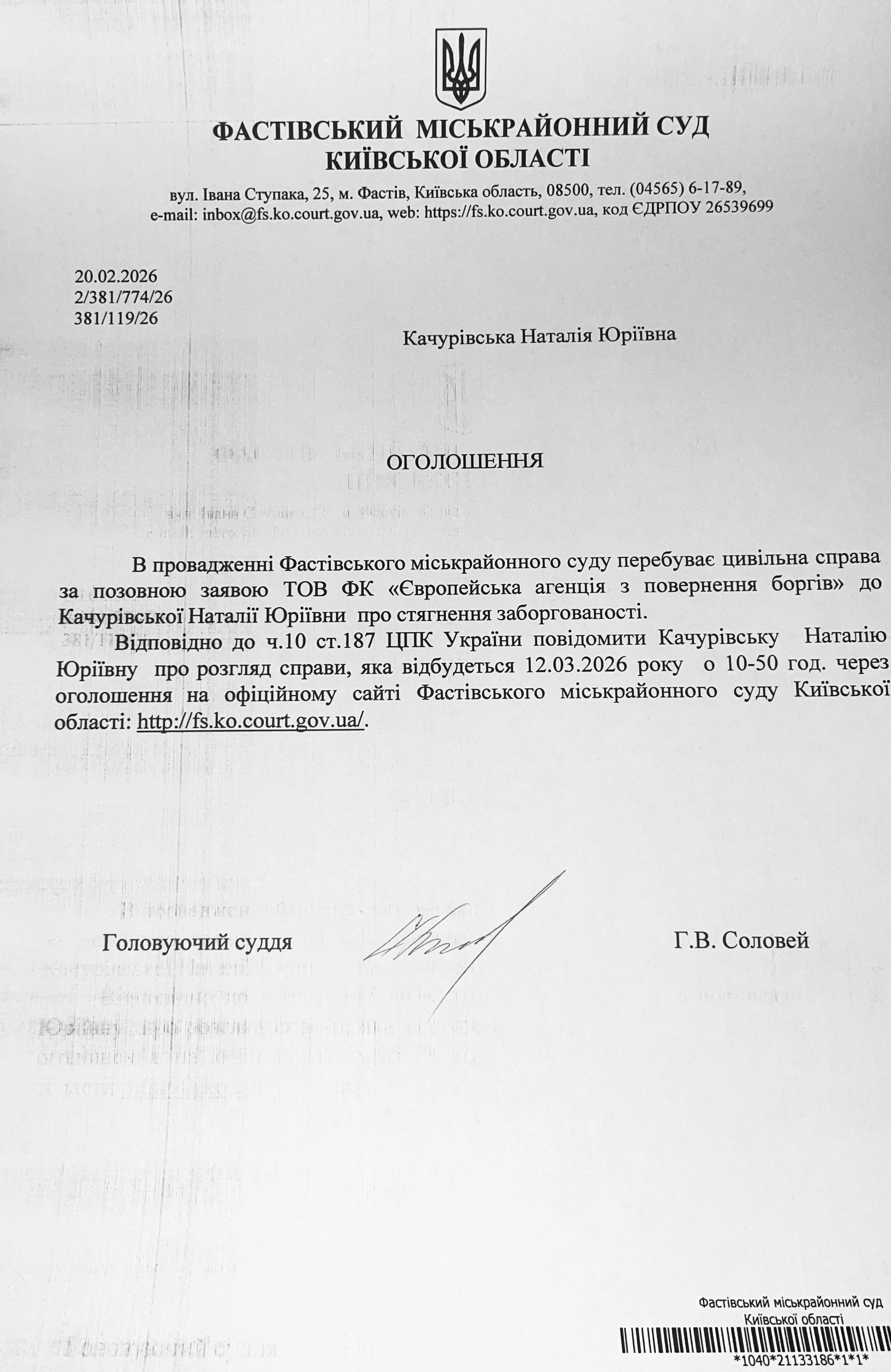 Фастівський міськрайонний суд Київської області викликає Качурівську Наталію Юріївну