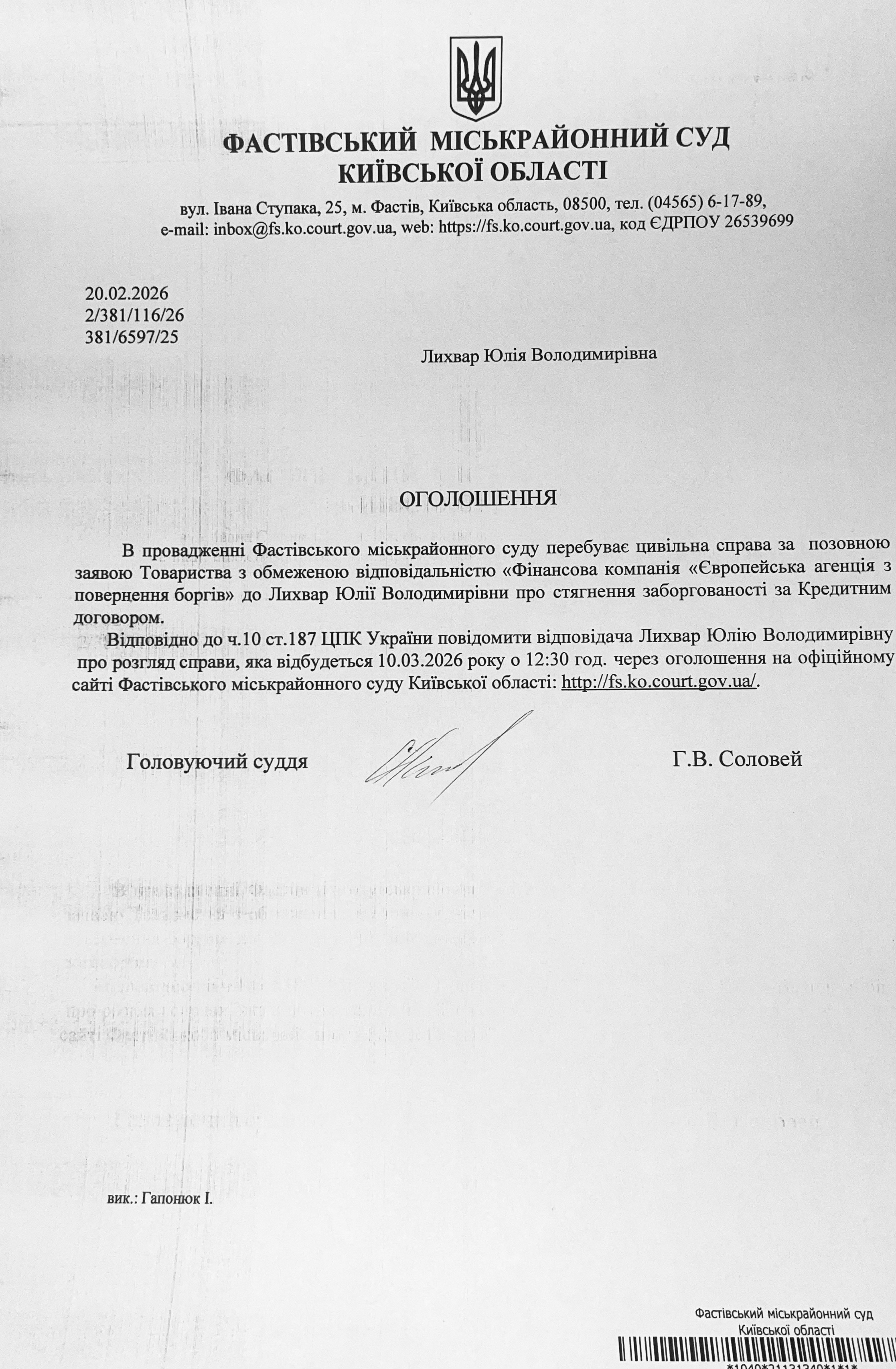 Фастівський міськрайонний суд Київської області викликає Лихвар Юлію Володимирівну