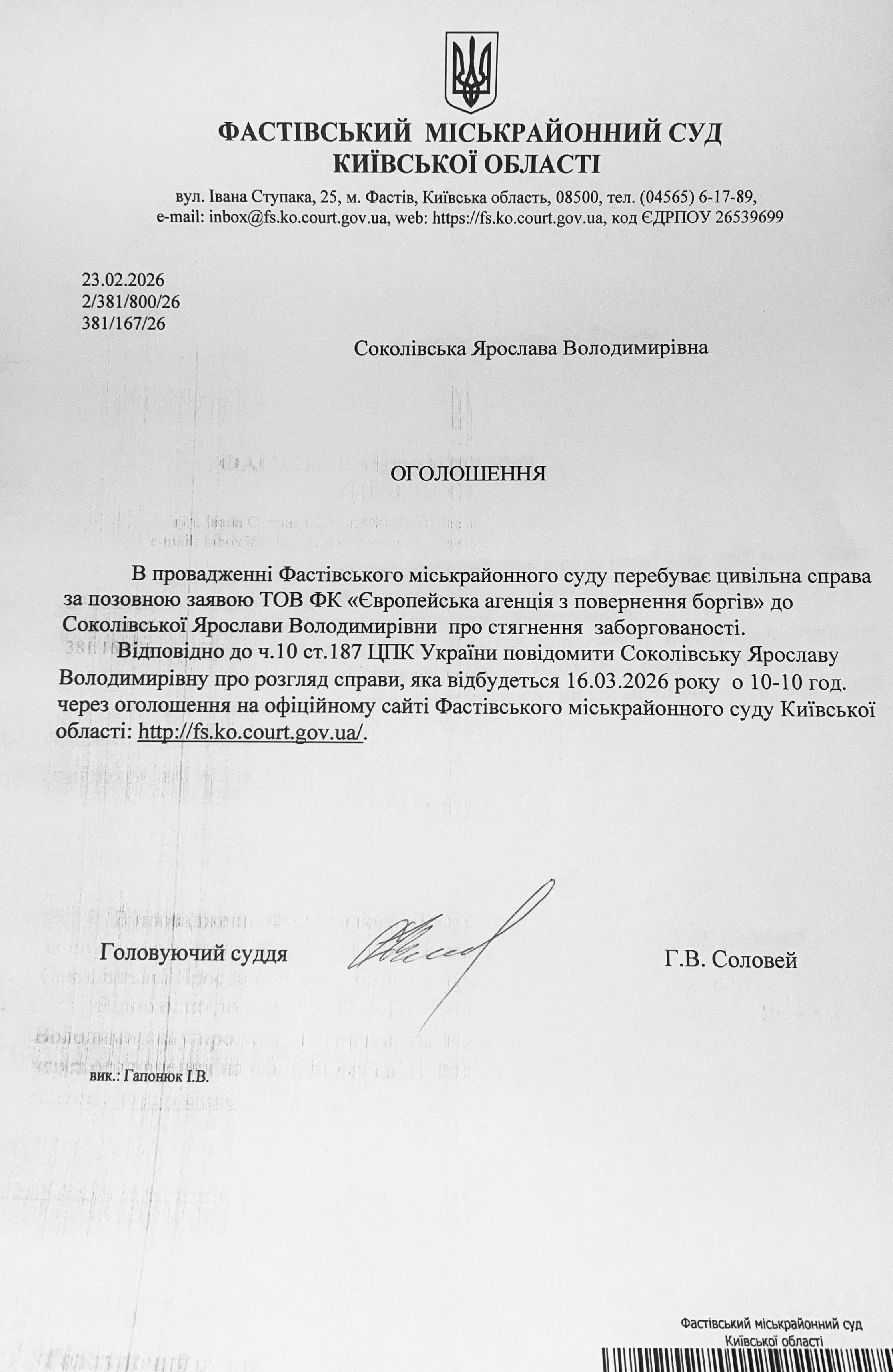 Фастівський міськрайонний суд Київської області викликає Соколівську Ярославу Володимирівну