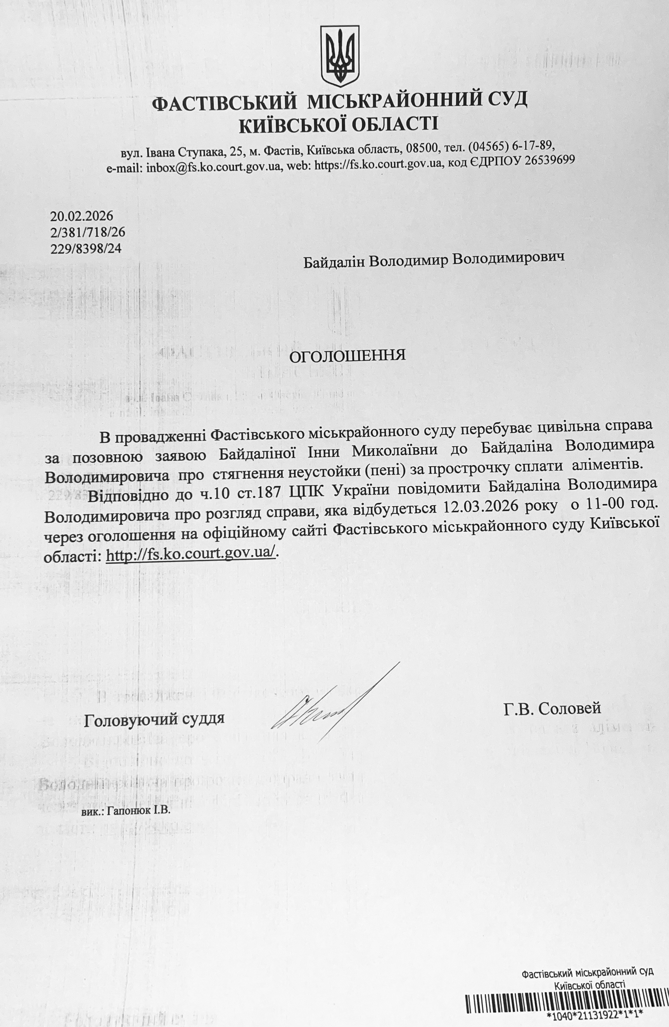 Фастівський міськрайонний суд Київської області викликає Байдахіна Володимира Володимировича