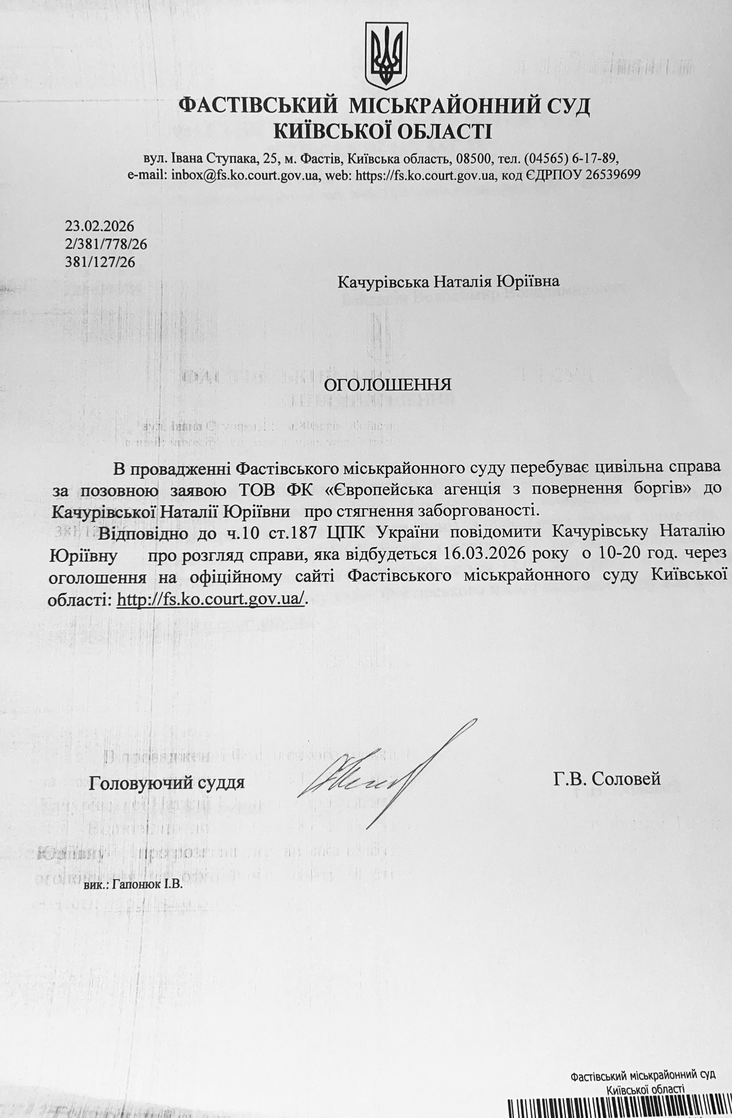 Фастівський міськрайонний суд Київської області викликає Качурівську Наталію Юріївну