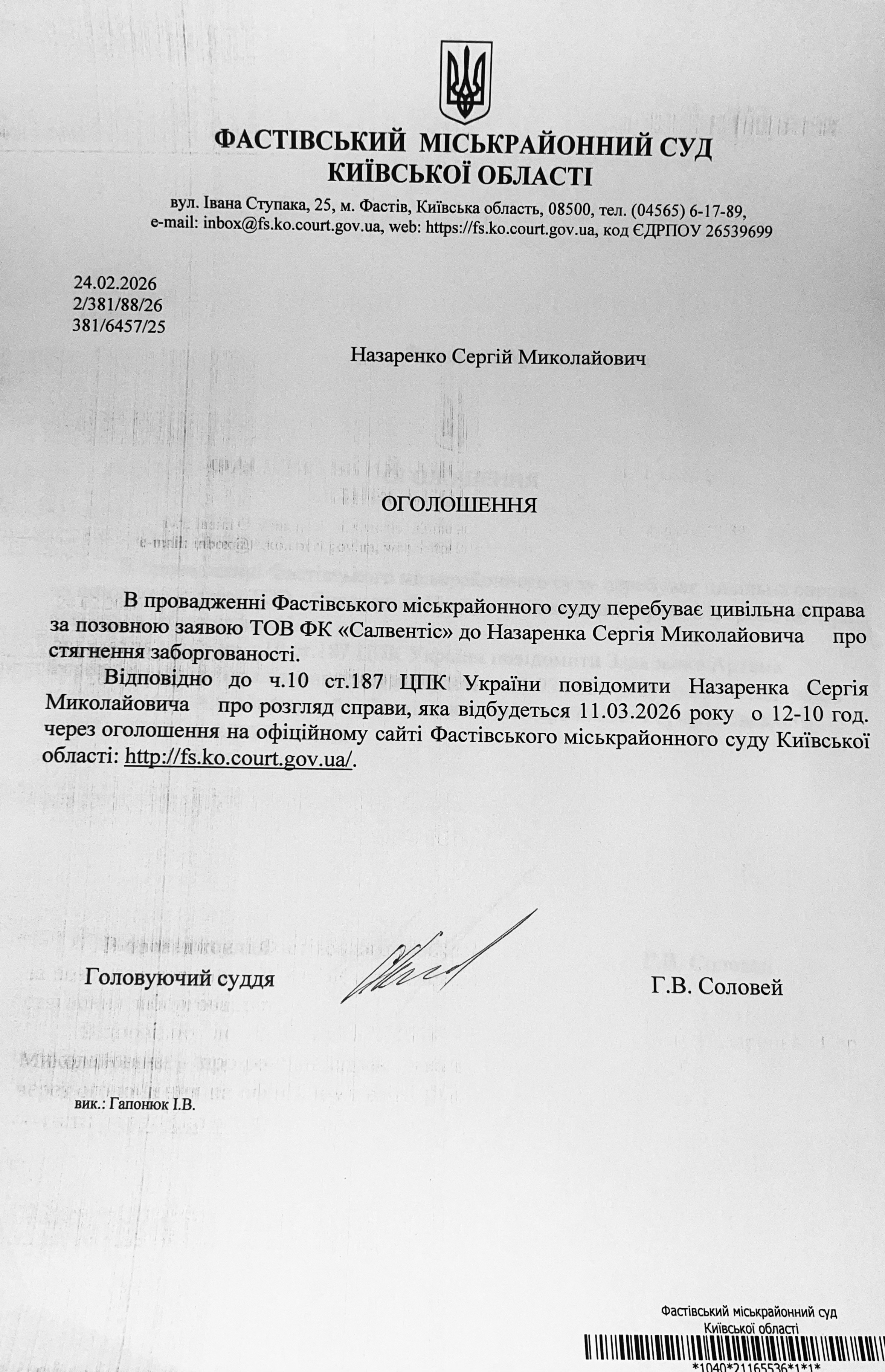 Фастівський міськрайонний суд Київської області викликає Назаренка Сергія Миколайовича