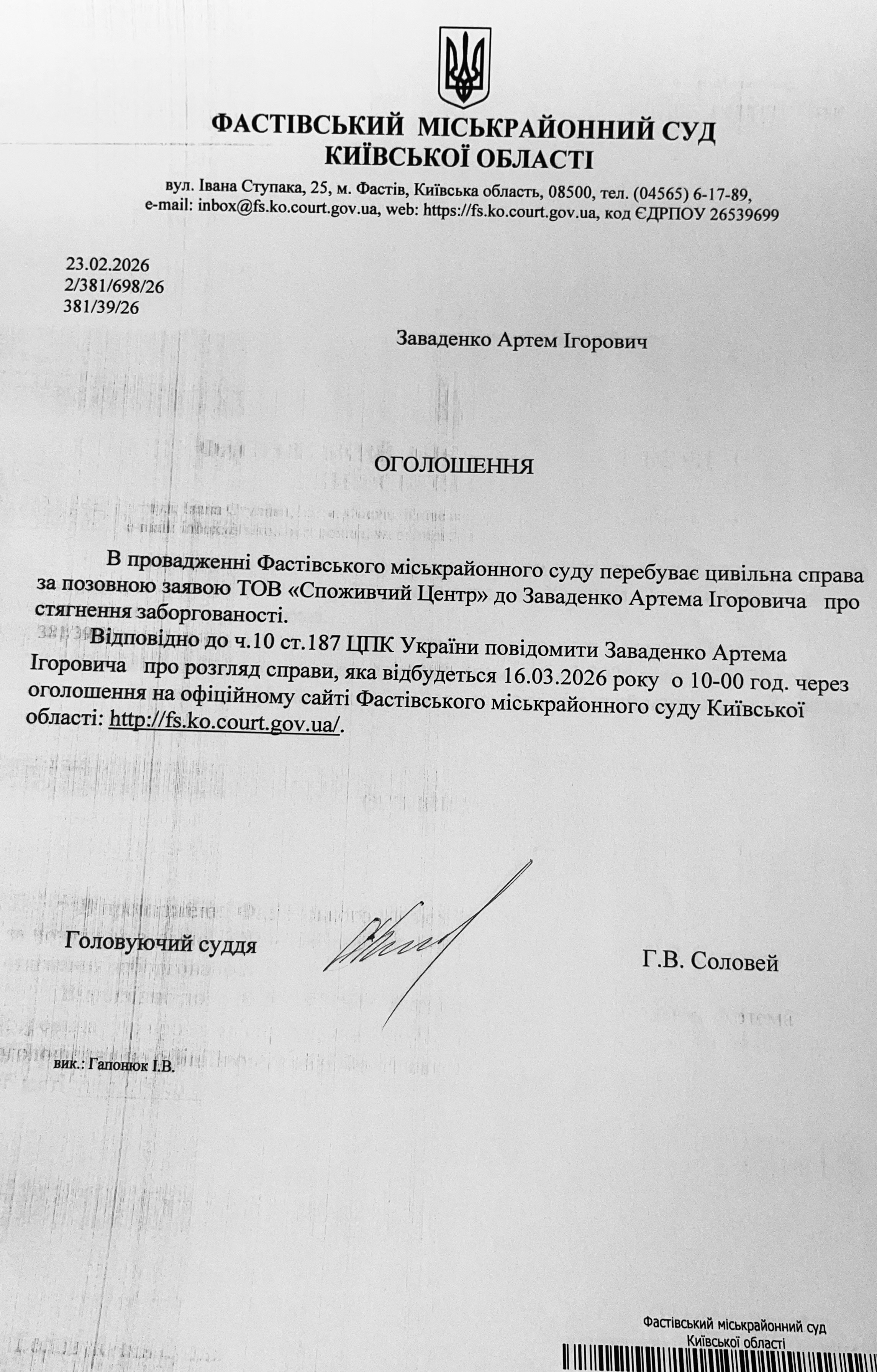 Фастівський міськрайонний суд Київської області викликає Заваденко Артема Ігоровича
