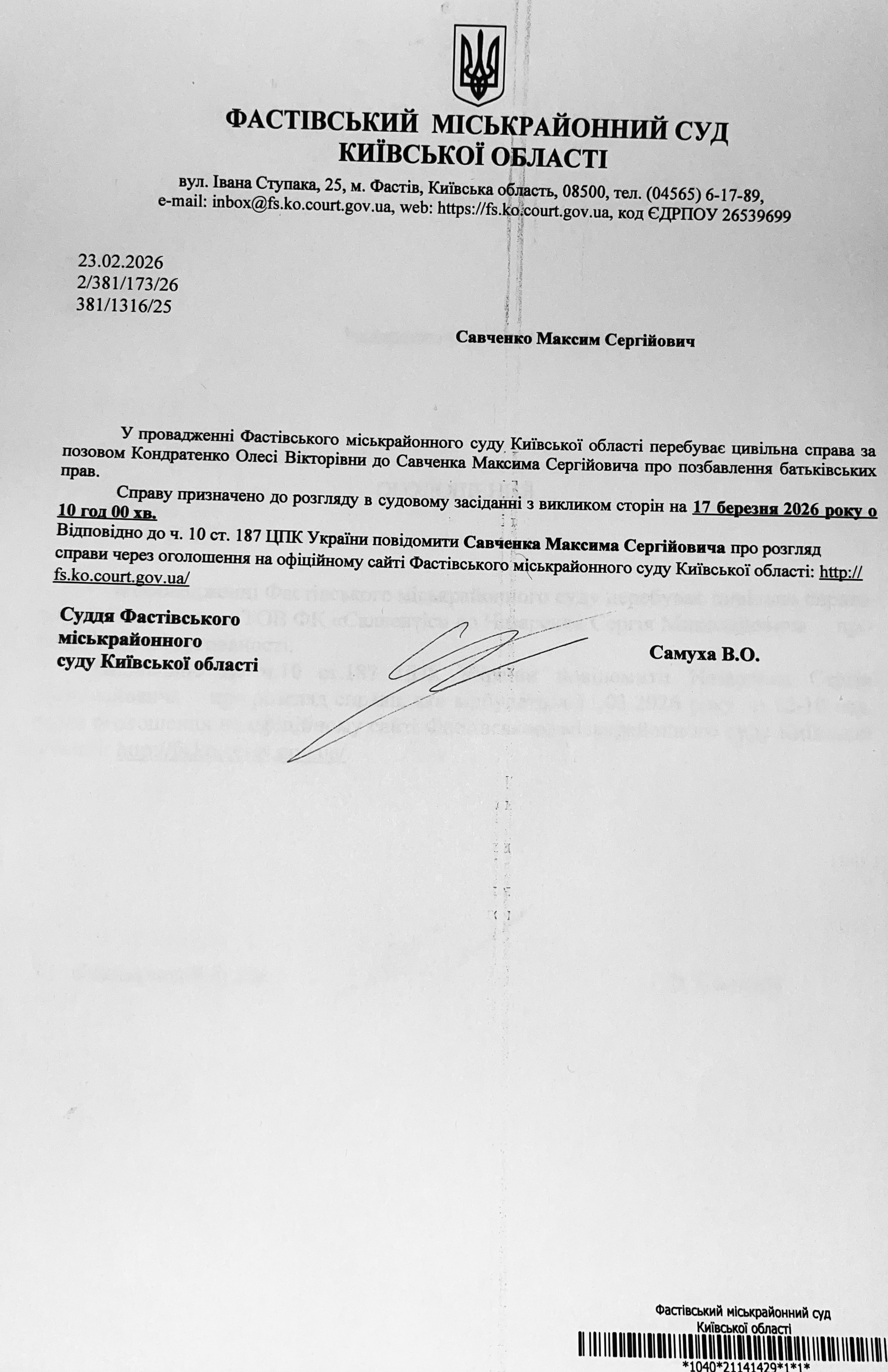 Фастівський міськрайонний суд Київської області викликає Савченка Максима Сергійовича