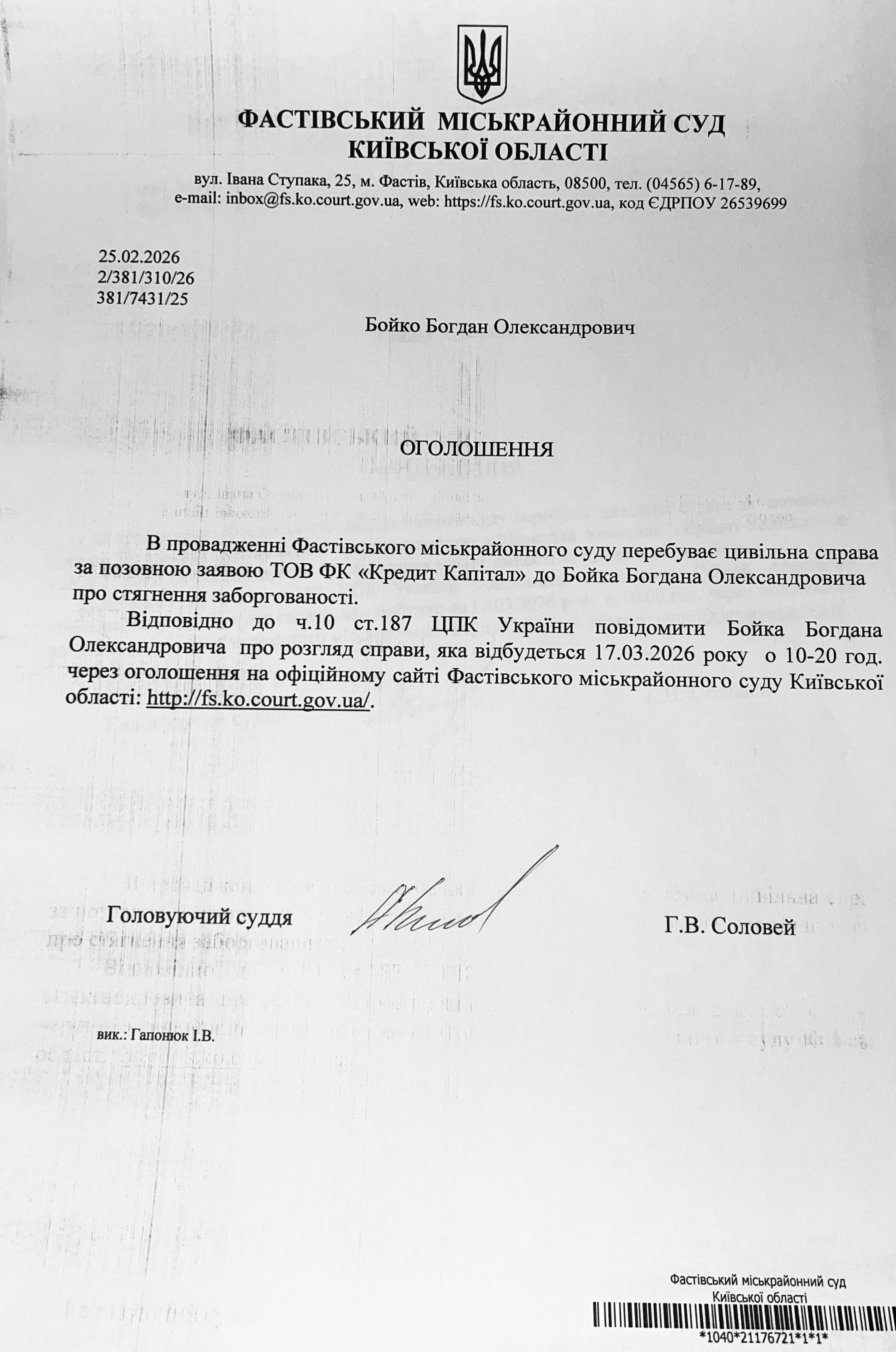 Фастівський міськрайонний суд Київської області викликає Бойко Богдана Олександровича