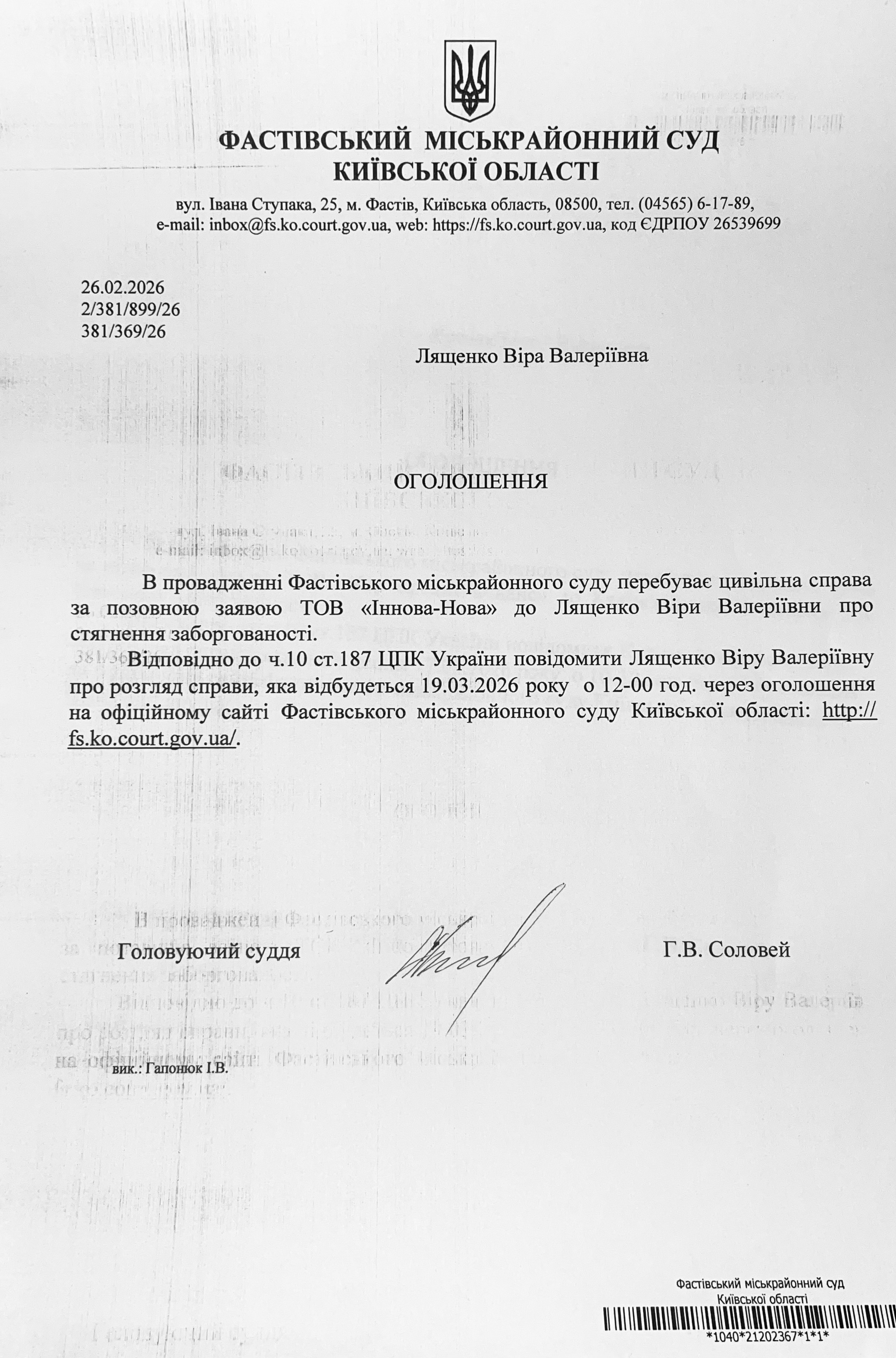 Фастівський міськрайонний суд Київської області викликає Лященко Віру Валеріївну