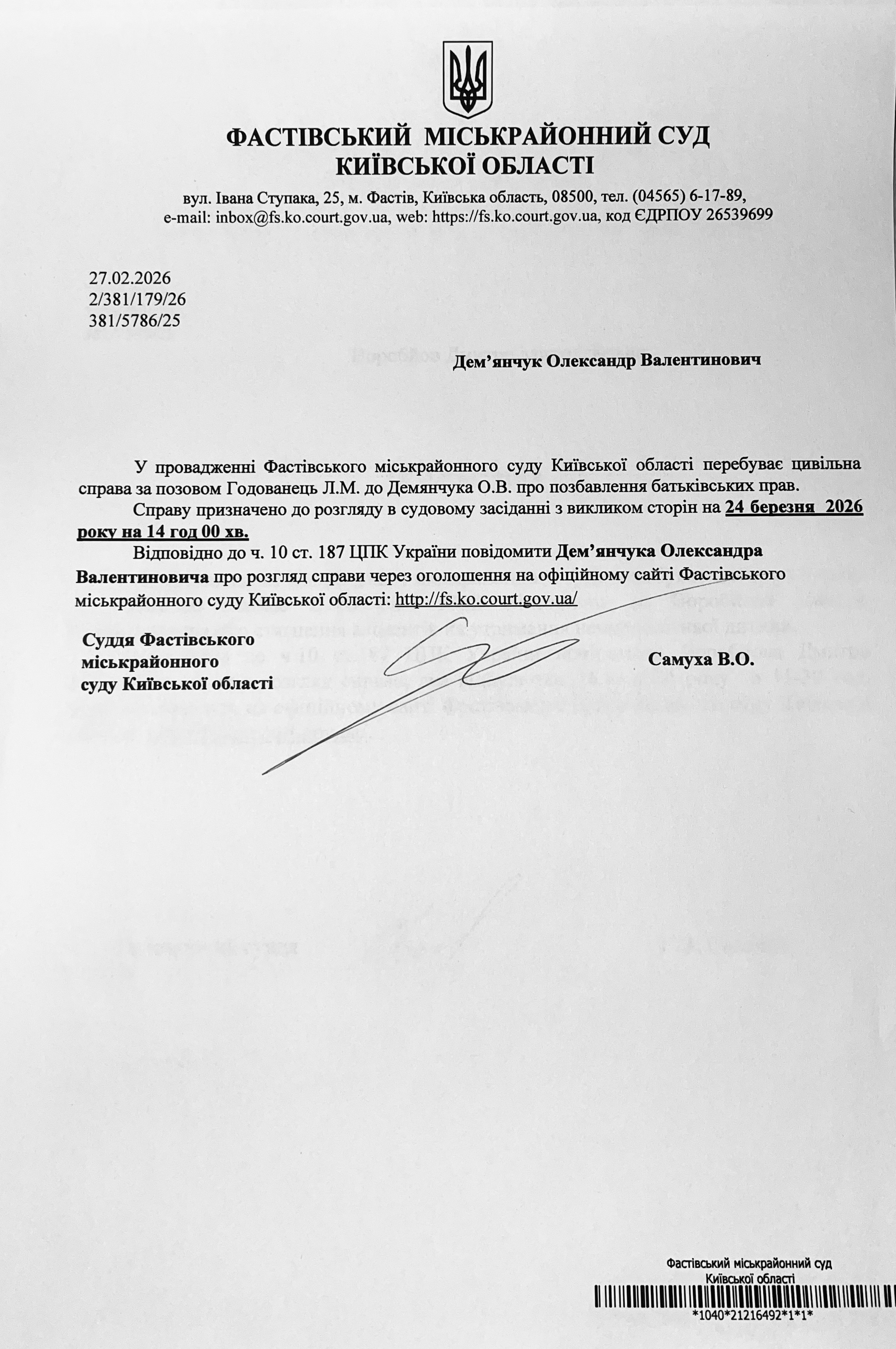 Фастівський міськрайонний суд Київської області викликає Дем'янчук Олександра Валентиновича