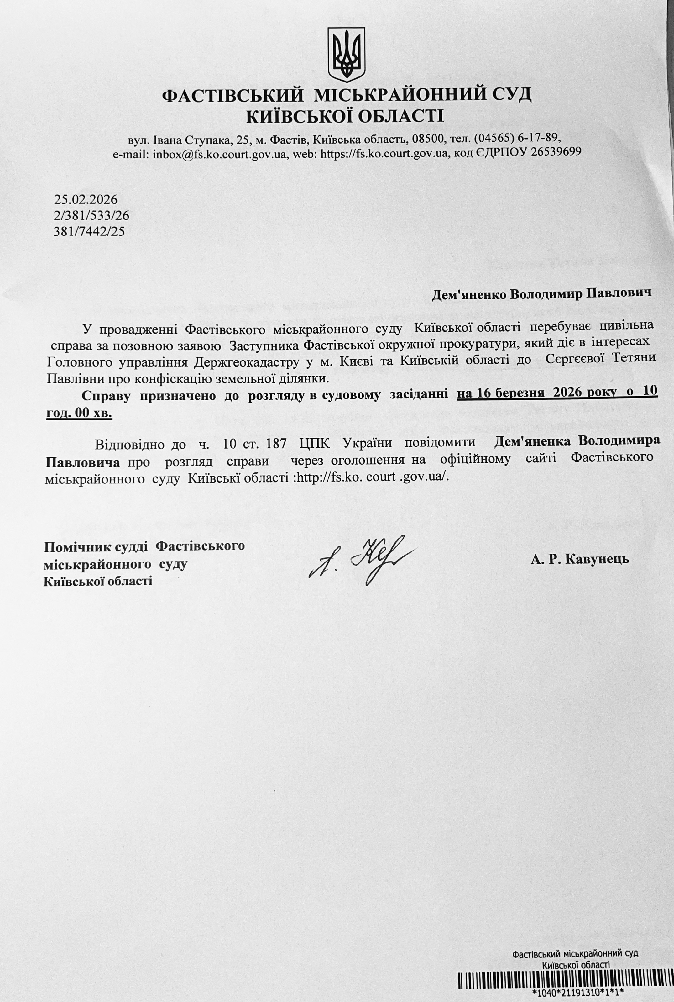 Фастівський міськрайонний суд Київської області викликає Дем'яненка Володимира Павловича