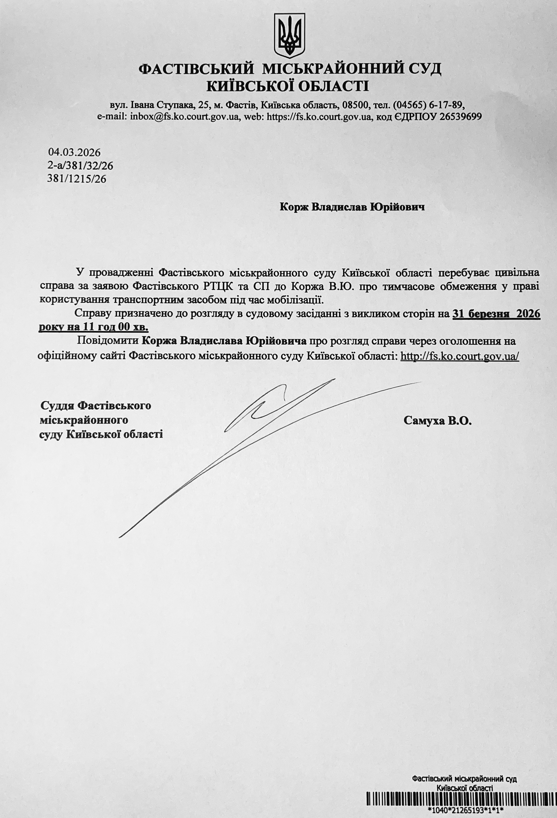 Фастівський міськрайонний суд Київської області викликає Коржа Владислава Юрійовича