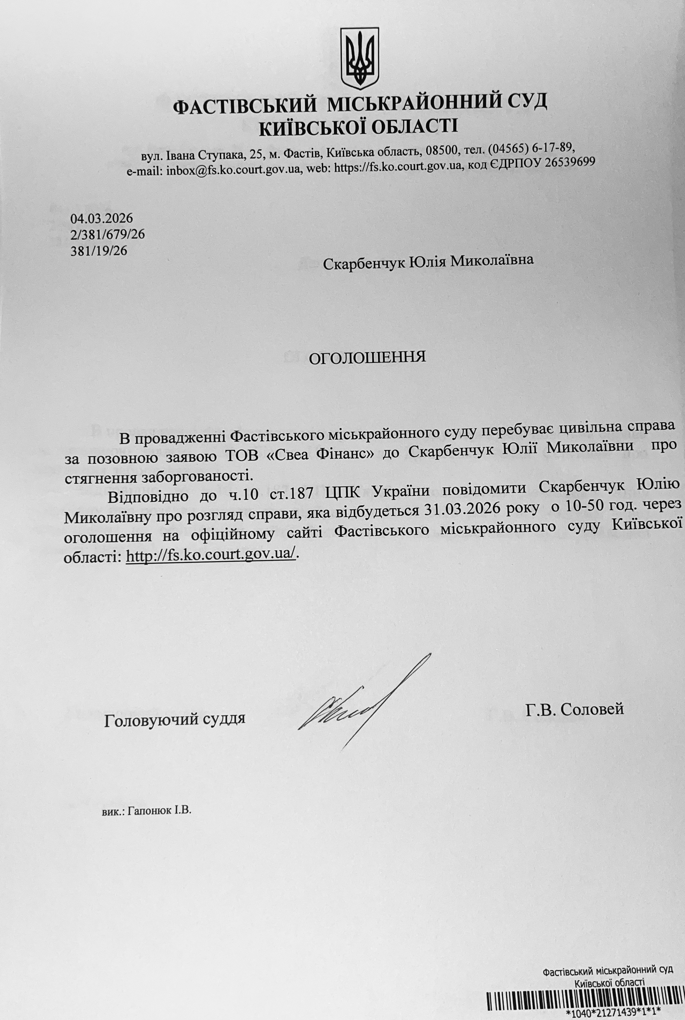Фастівський міськрайонний суд Київської області викликає Скарбенчук Юлію Миколаївну
