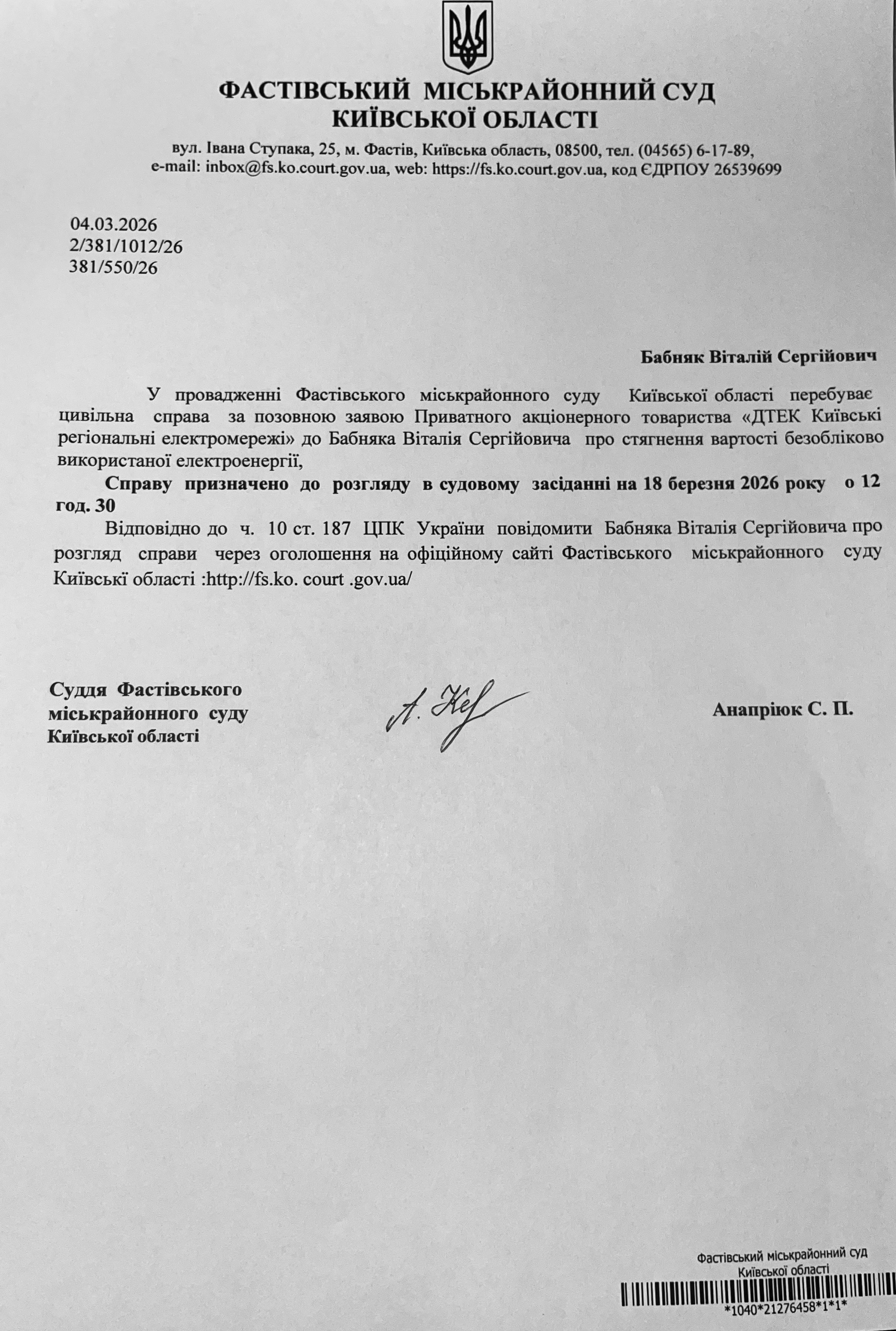 Фастівський міськрайонний суд Київської області викликає Бабняка Віталія Сергійовича на 18.03.2026 о 12 год 30 хв