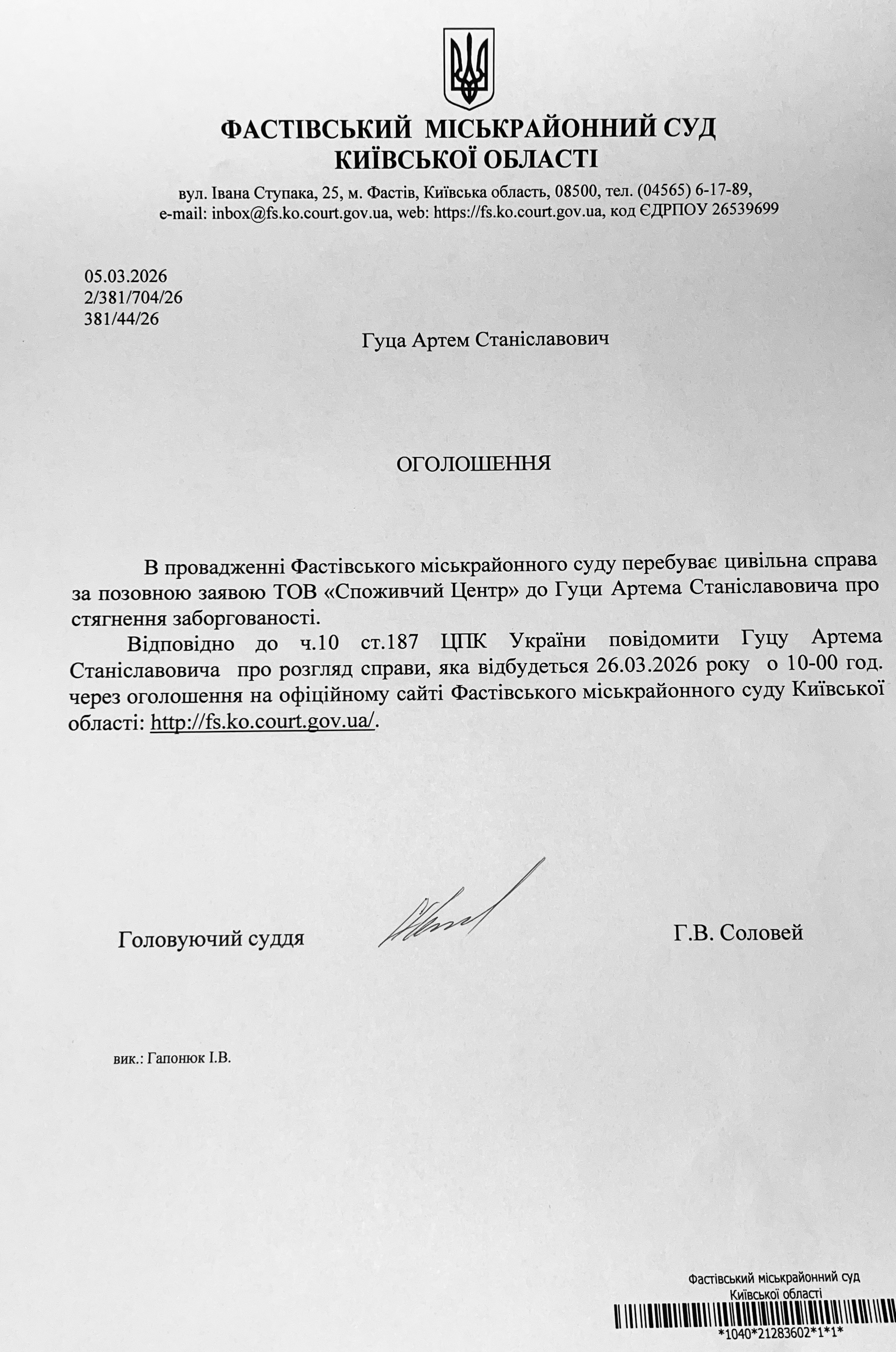 Фастівський міськрайонний суд Київської області викликає Гуца Артема Станіславовича