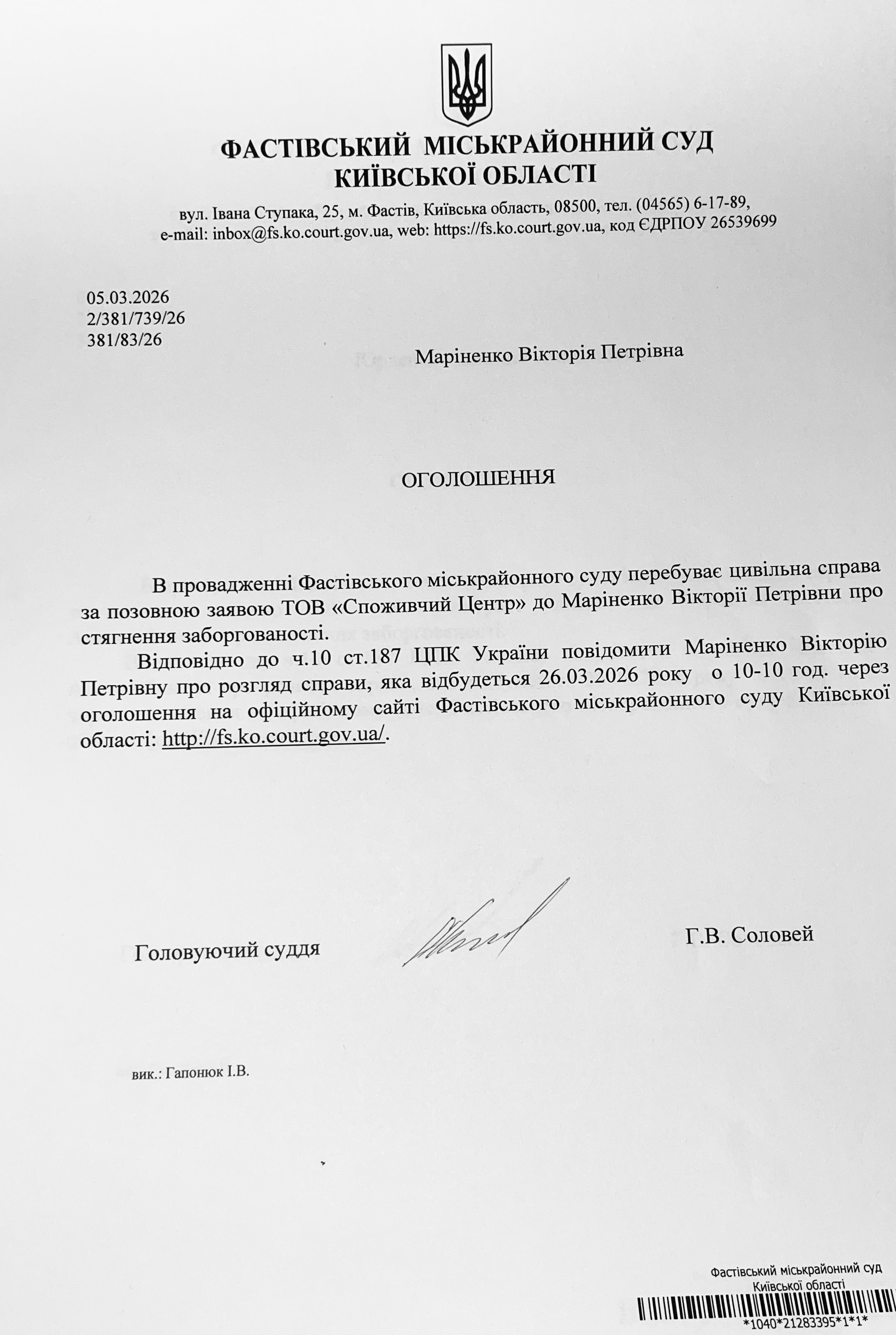Фастівський міськрайонний суд Київської області викликає Маріненко Вікторію Петрівну