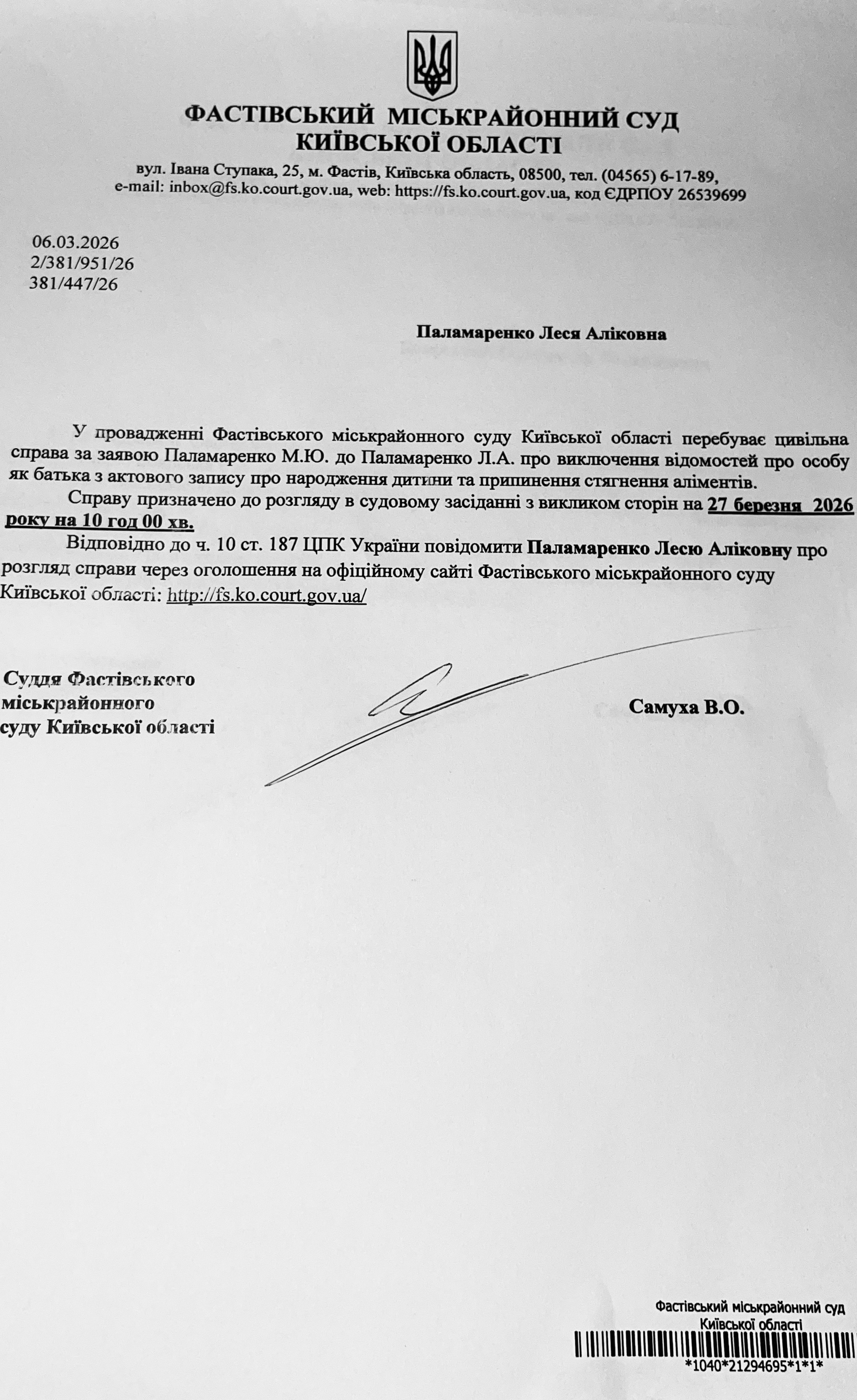 Фастівський міськрайонний суд Київської області викликає Паламаренко Лесю Аліковну